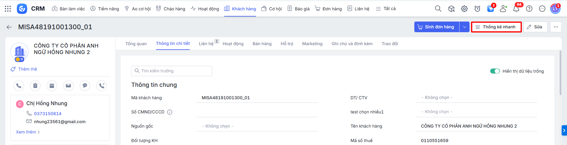 Bước 2: Người dùng khai báo các thông tin chi tiết trong Đơn hàng/Cơ hội/Báo giá tương ứng. ![]() Bước 3: Nhấn Lưu để tạo đơn hàng. 4.2. Xem thống kê nhanh hàng hóa đã muaCho phép xem thống kê nhanh toàn bộ doanh số, hàng hóa đã mua của khách hàng cụ thể. Bước 1: Ở chi tiết bản ghi khách hàng, nhấn Thống kê nhanh