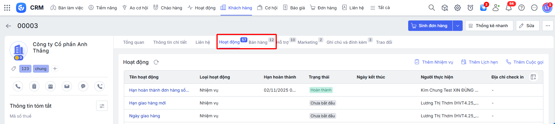 Hướng dẫn sinh Đơn hàng, Cơ hội, Báo giá và xem thống kê mua hàng trực tiếp từ bản ghi Khách hàng.