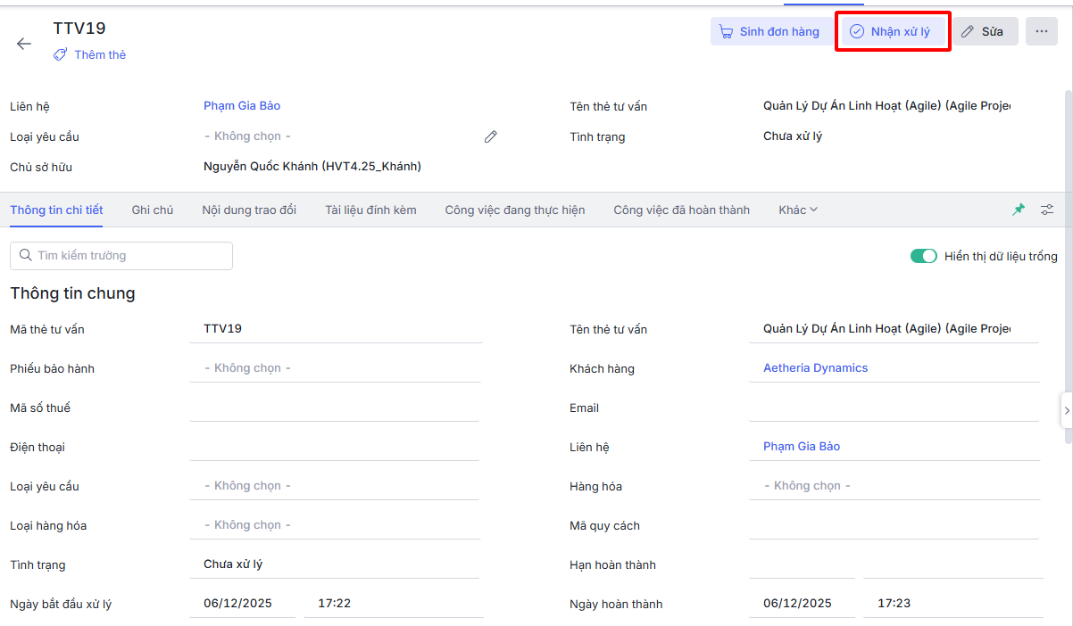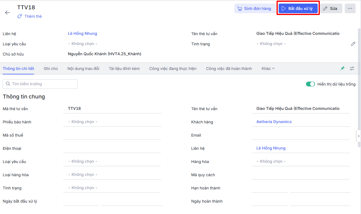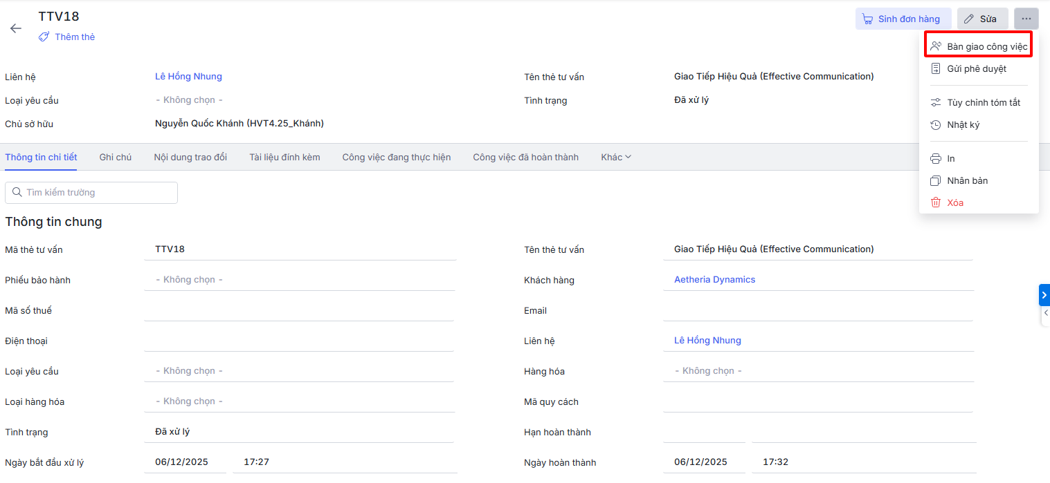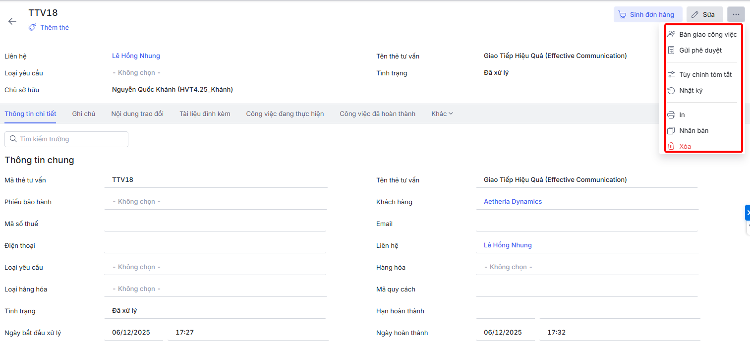 - Thao tác chi tiết với Thẻ tư vấn: nhận xử lý, sửa, bàn giao công việc, gửi phê duyệt, tùy chỉnh tóm tắt, nhân bản, xóa
