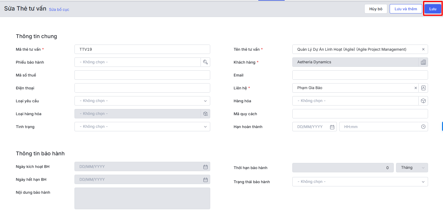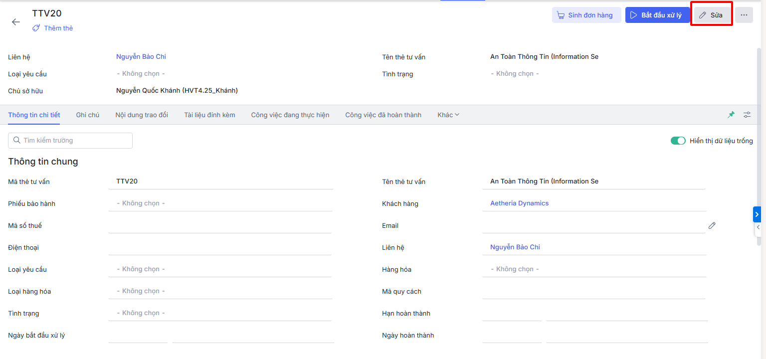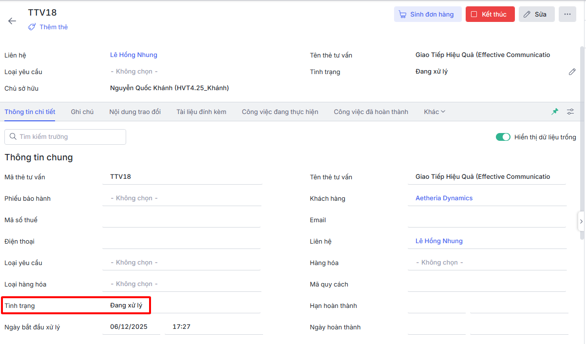 - Thao tác chi tiết với Thẻ tư vấn: nhận xử lý, sửa, bàn giao công việc, gửi phê duyệt, tùy chỉnh tóm tắt, nhân bản, xóa