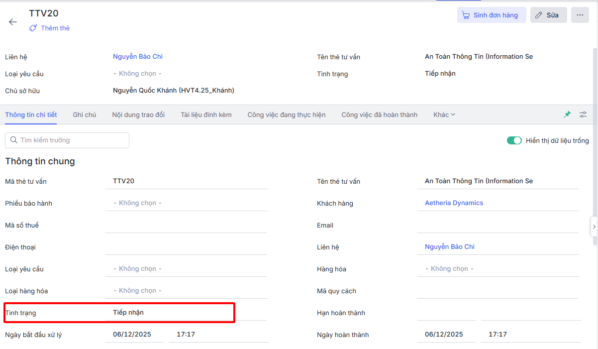 - Thao tác chi tiết với Thẻ tư vấn: nhận xử lý, sửa, bàn giao công việc, gửi phê duyệt, tùy chỉnh tóm tắt, nhân bản, xóa
