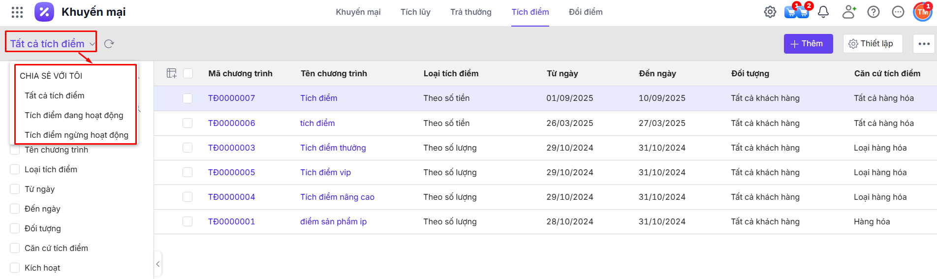 - Ở tab Tích điểm\ AMIS Khuyến mại hiện cung cấp sẵn các giao diện: Tất cả tích điểm, Tích điểm đang hoạt động, Tích điểm ngừng hoạt động.