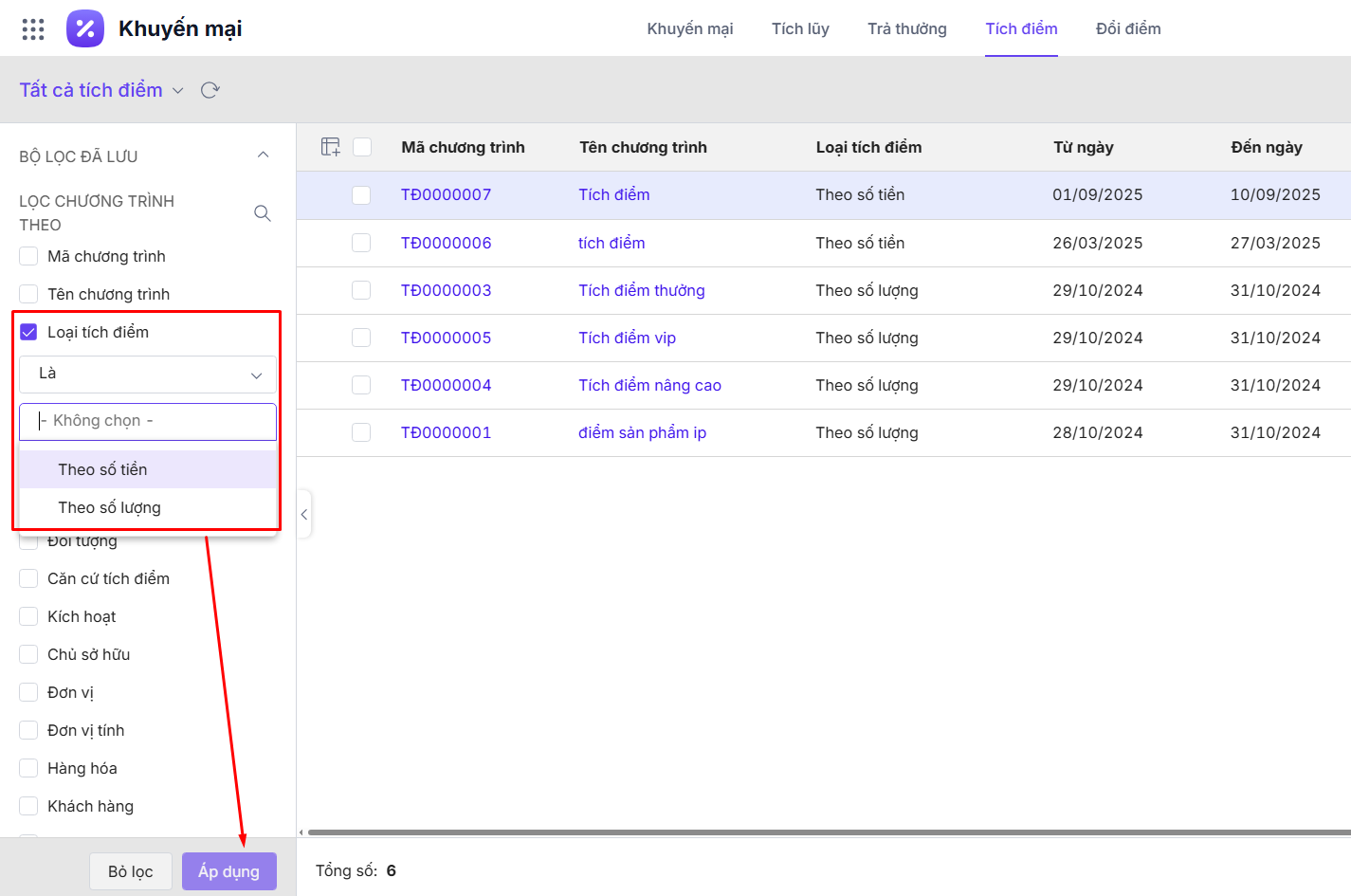- Sử dụng bộ lọc để tìm kiếm Chương trình tích điểm.