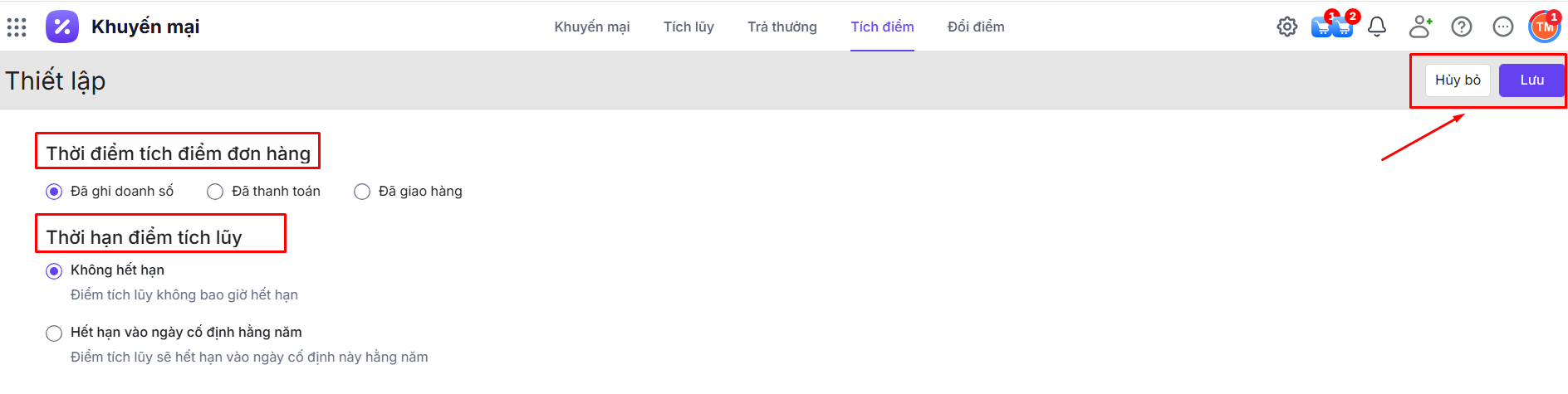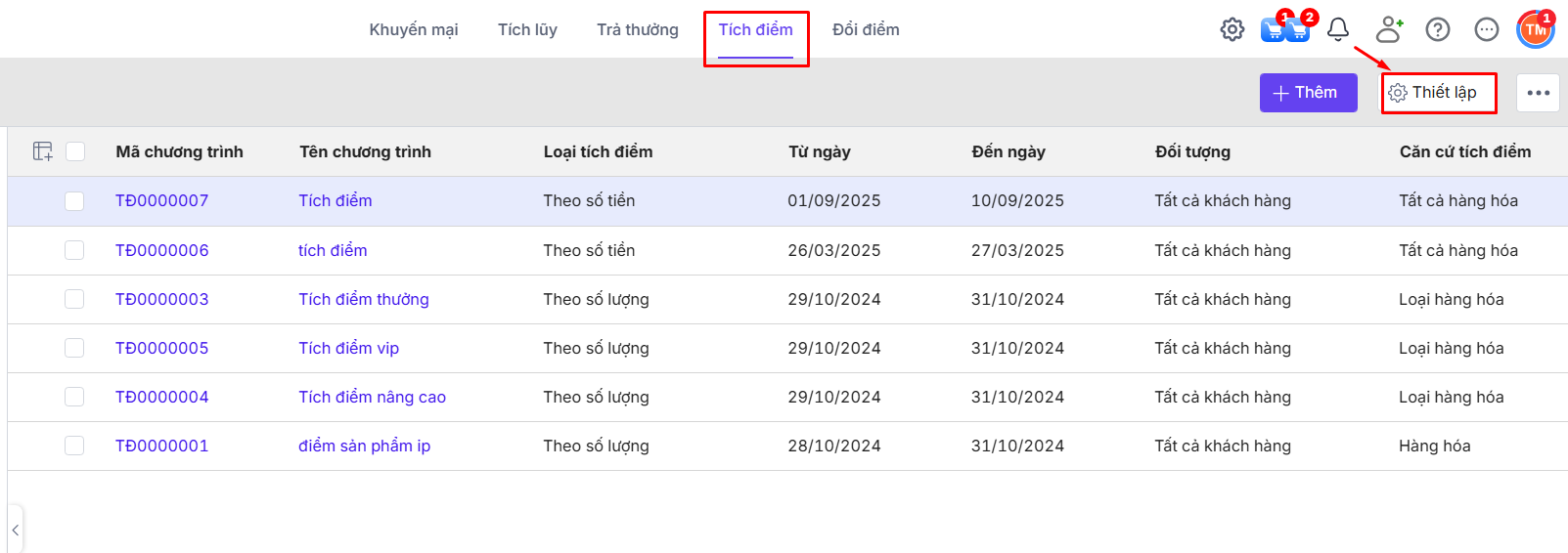 Bước 1: Ở tab Tích điểm\ Nhấn Thiết lập.
