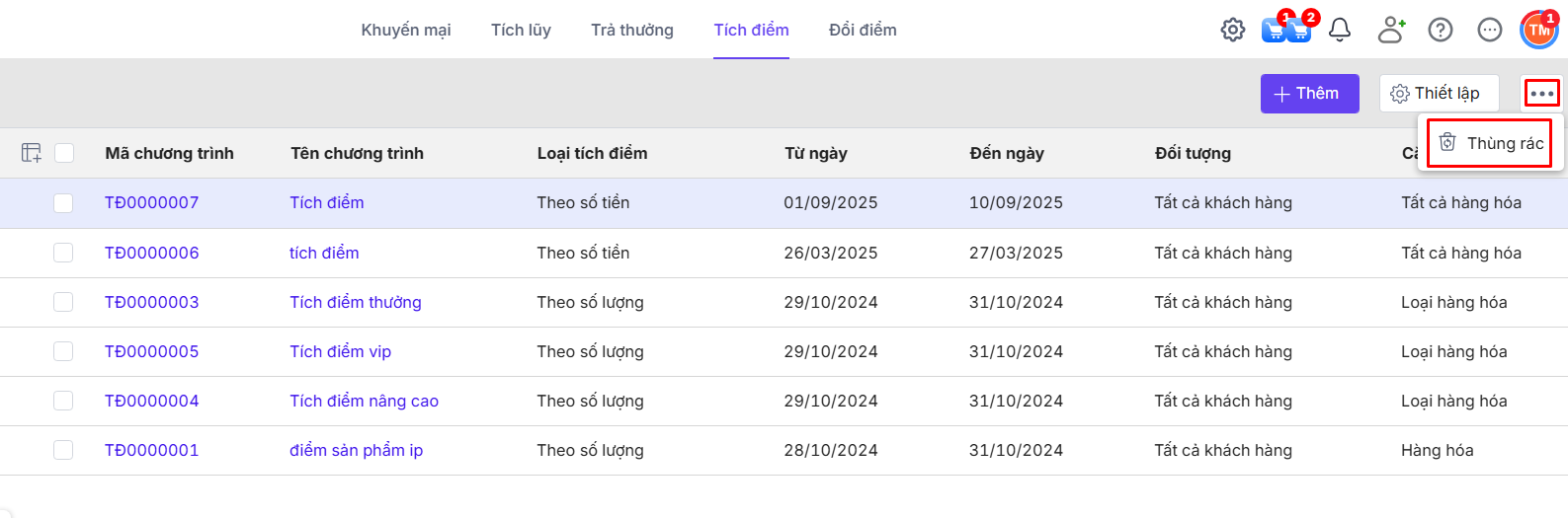 - Quản lý các Chương trình tích điểm trong Thùng rác.