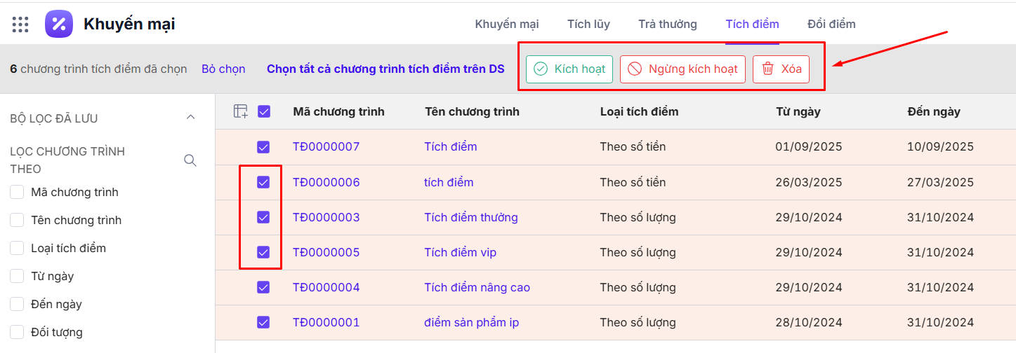 - Xóa: Cho phép xóa chương trình tích điểm.