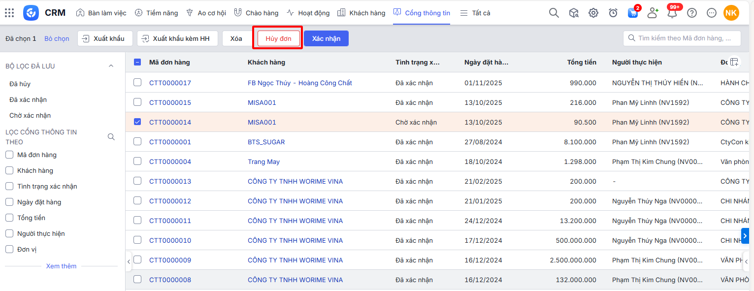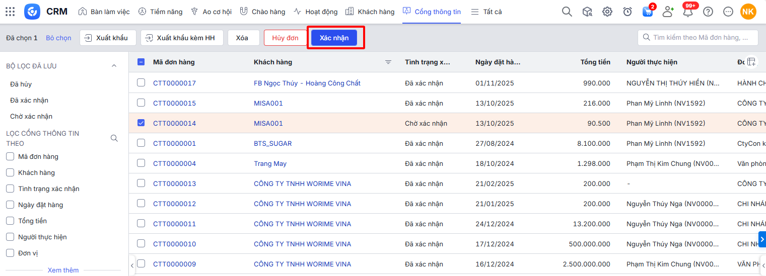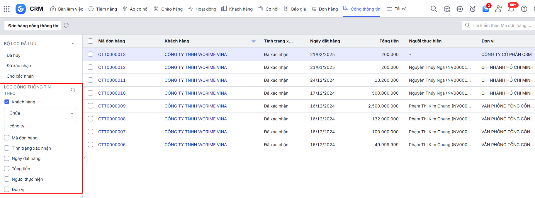 - Danh sách đơn hàng từ Cổng thông tin, thiết lập bộ lọc tìm kiếm