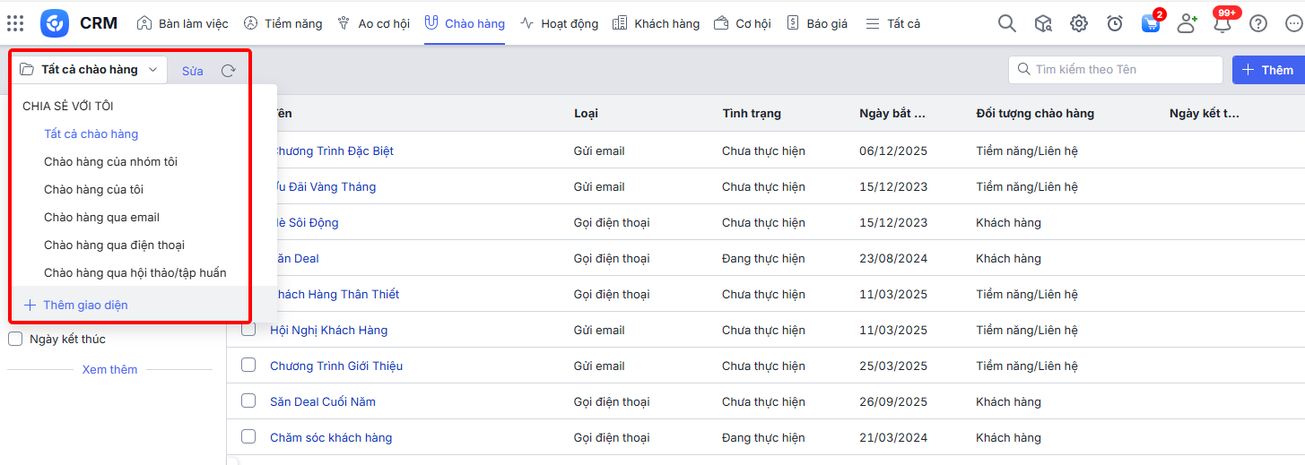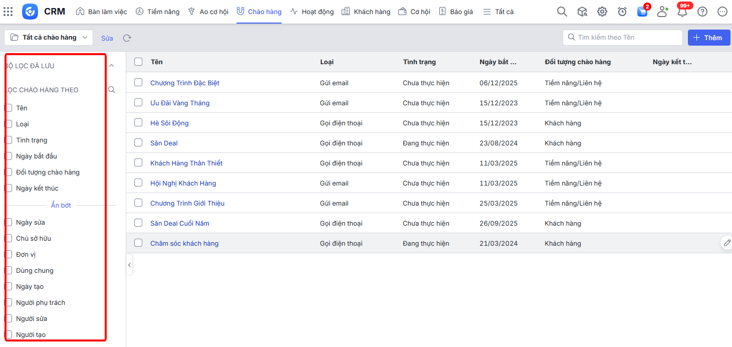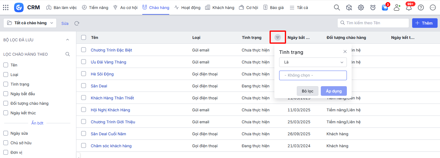 - Thiết lập giao diện và bộ lọc danh sách Chào hàng