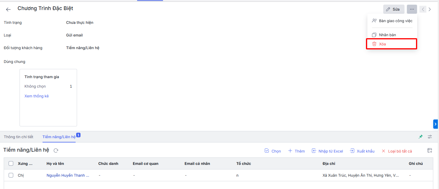- Thực hiện các chức năng cho từng bản ghi: bàn giao công việc, in nhãn thư, xóa bản ghi