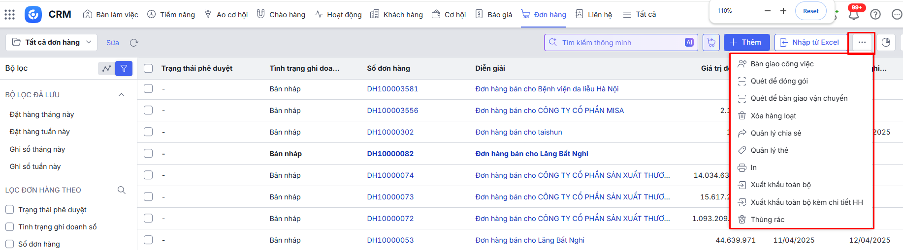 Tại màn hình danh sách Đơn hàng, nhấn vào biểu tượng  để hiển thị các chức năng hàng loạt như Bàn giao công việc, Xóa hàng loạtCập nhật hàng loạtQuản lý thẻ,…