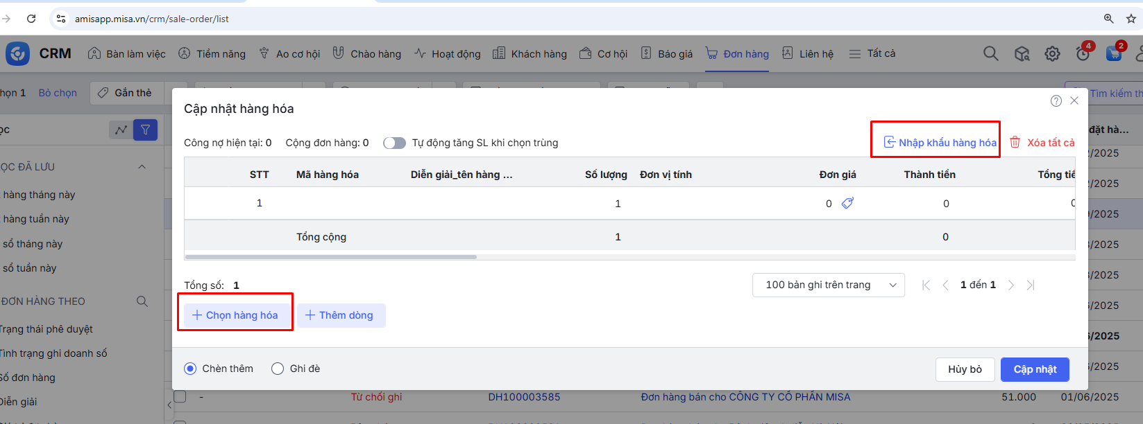 Bước 3: Người dùng chọn Chèn thêm để thêm hàng hóa vào cuối cùng bảng thông tin hàng hóa của tất cả đơn hàng được chọn hoặc Ghi đè để thay thế toàn bộ hàng hóa trong đơn hàng được chọn bằng các hàng hóa được chọn.