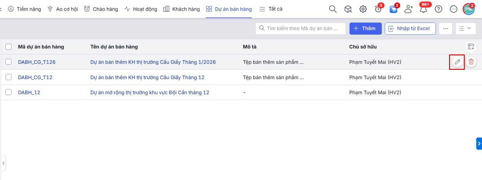 Bước 1: Tại danh sách Dự án bán hàng\Di chuột tới dự án cụ thể để hiển thị chức năng sửa (cây bút)\Nhấn vào biểu tượng cây bút ![]()