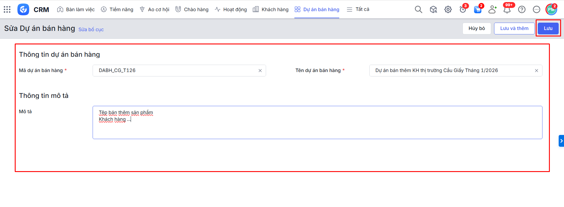 Bước 2: Tại chi tiết Sửa Dự án bán hàng, sửa lại các thông tin.