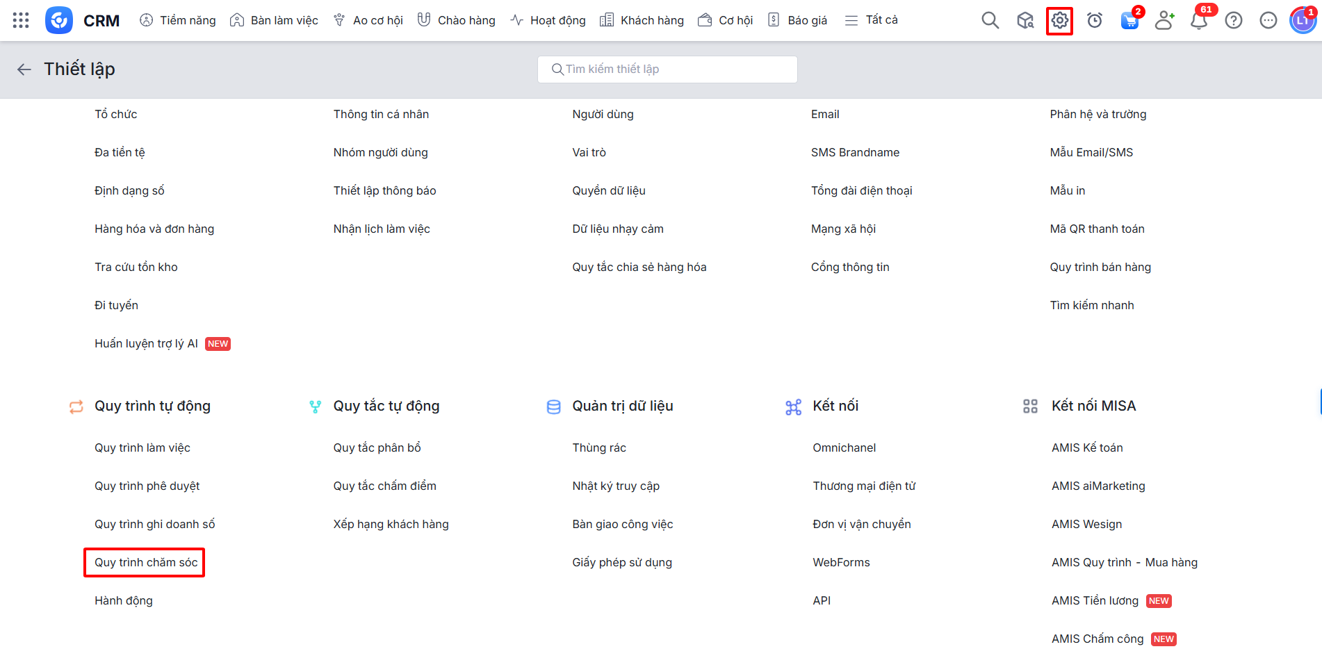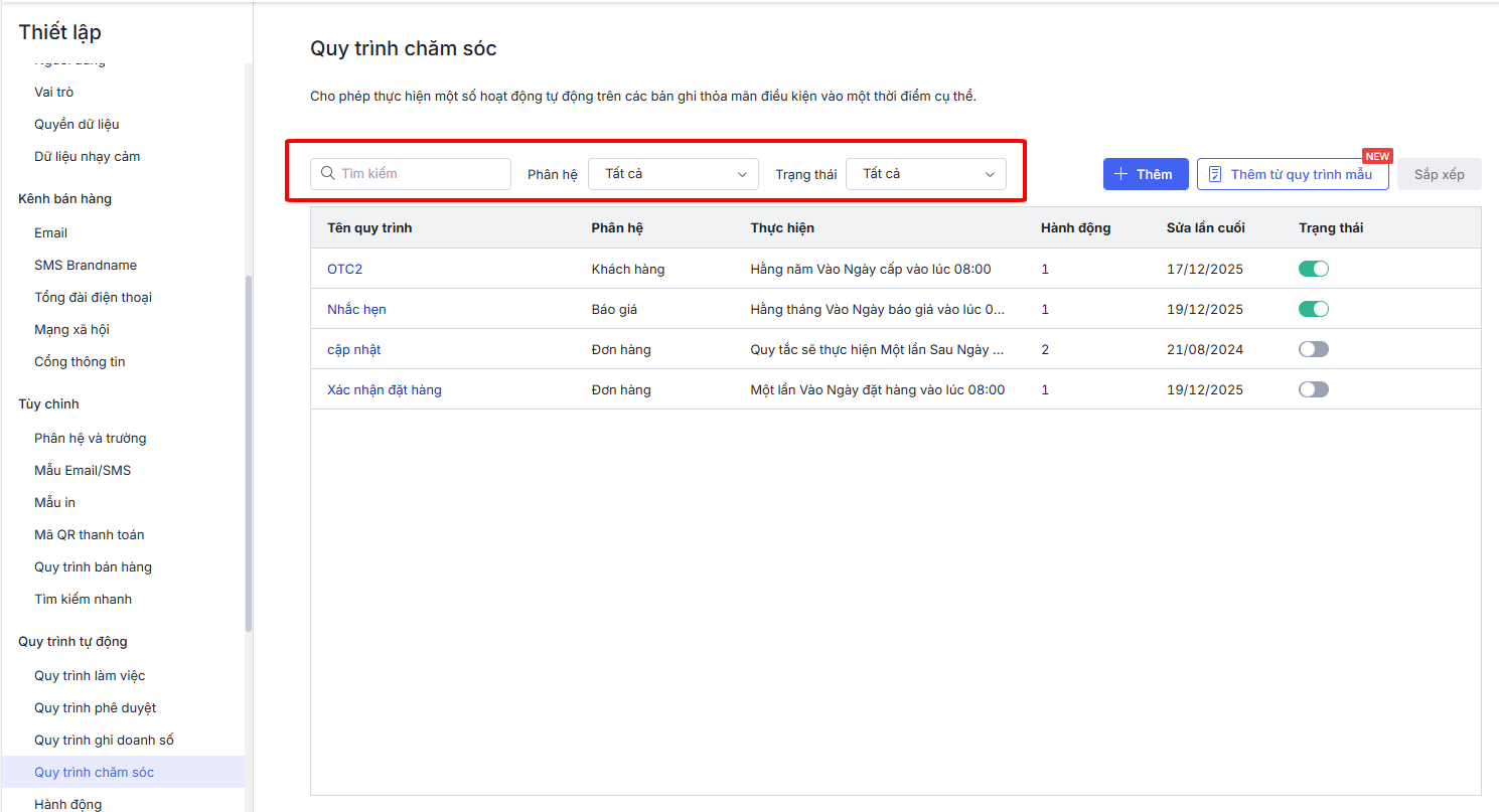 Bài viết hướng dẫn các thao tác để quản lý danh sách các Quy trình chăm sóc đã được thiết lập trên AMIS CRM. Việc này giúp người dùng dễ dàng theo dõi tổng quan, tìm kiếm, kiểm soát trạng thái hoạt động (bật/tắt) và dọn dẹp các quy trình không còn sử dụng, từ đó đảm bảo hệ thống tự động hóa luôn hoạt động một cách gọn gàng, hiệu quả và đúng với mục tiêu kinh doanh.