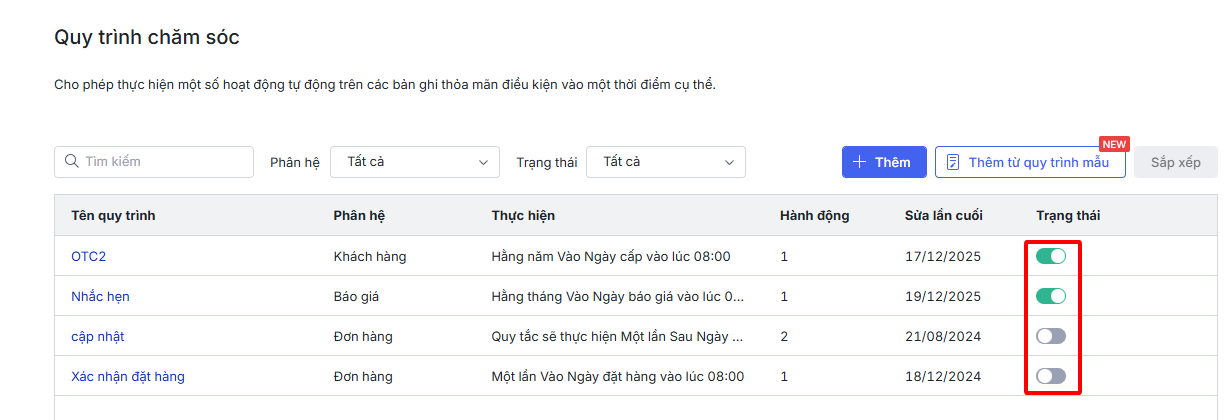 Bước 4: Ở màn hình danh sách Quy trình chăm sóc, thực hiện Kích hoạt/Ngừng kích hoạt Quy trình chăm sóc bằng cách Bật/Tắt biểu tượng tại cột Trạng thái.