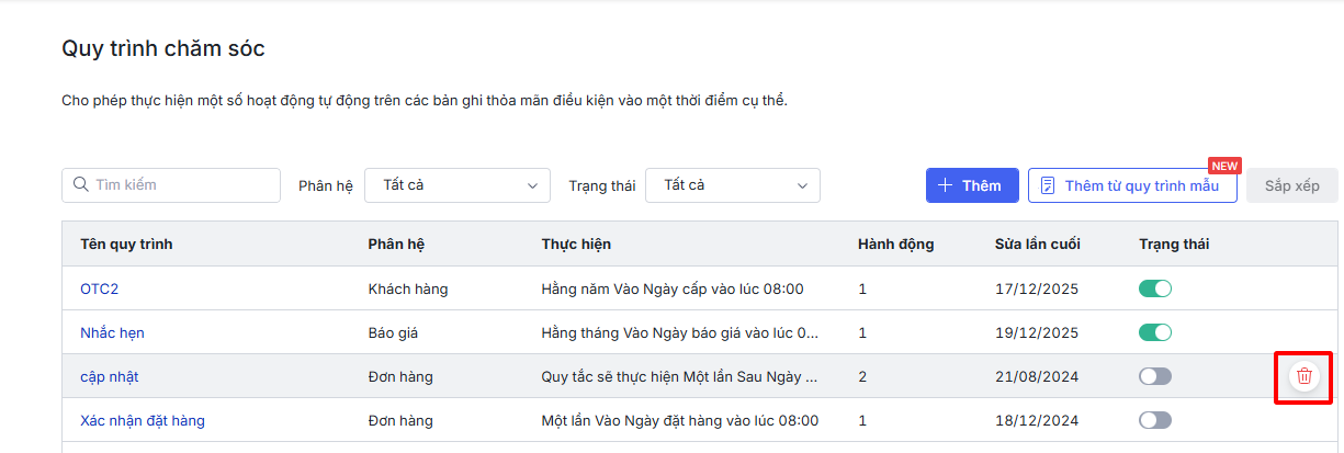 Bước 5: Để Xóa Quy trình chăm sóc, di chuột vào dòng quy trình và nhấn biểu tượng thùng rác