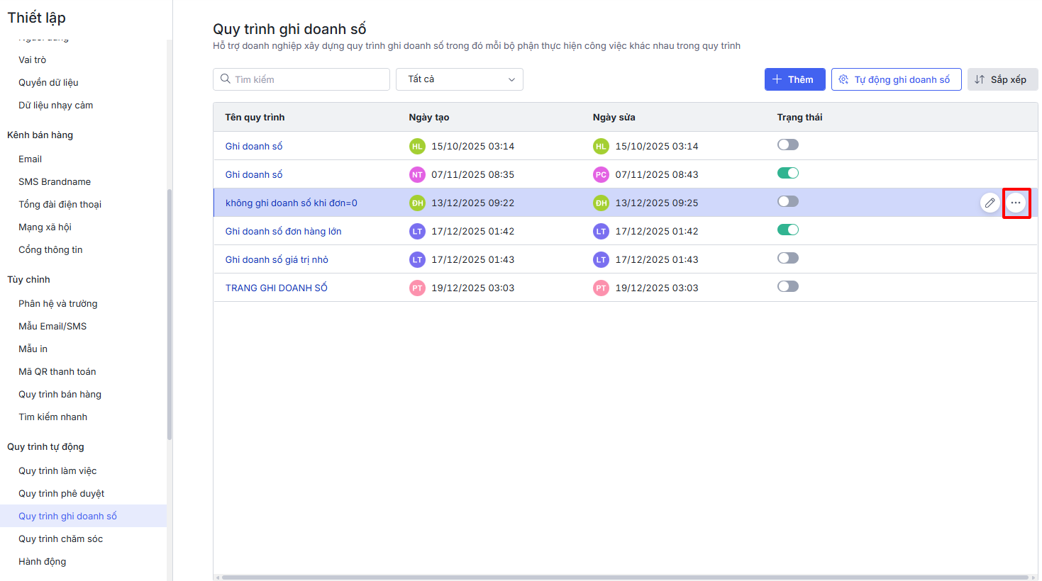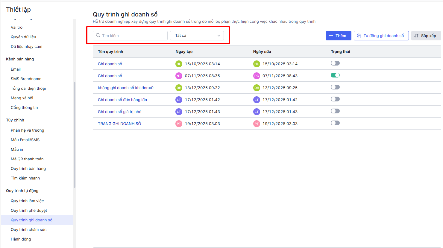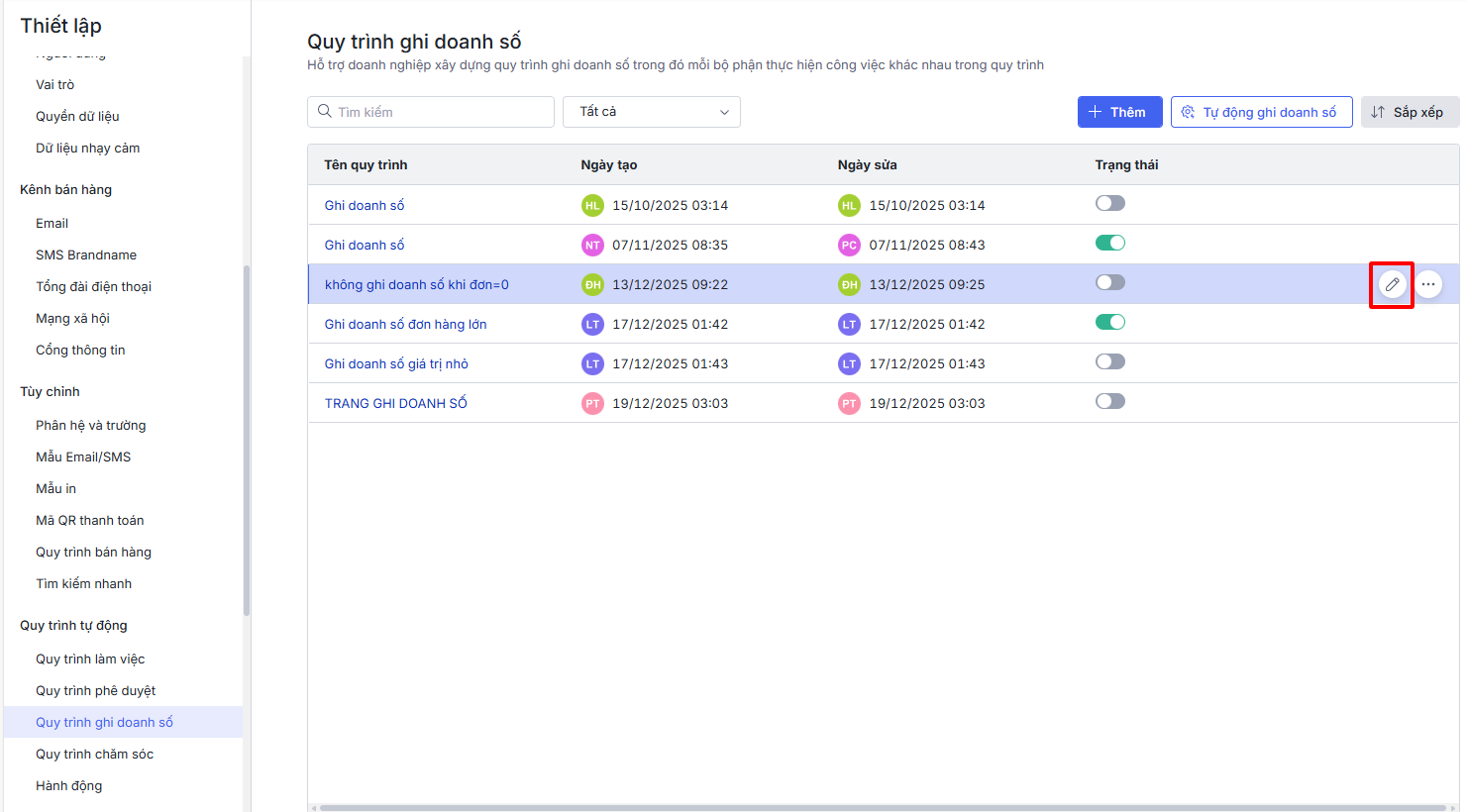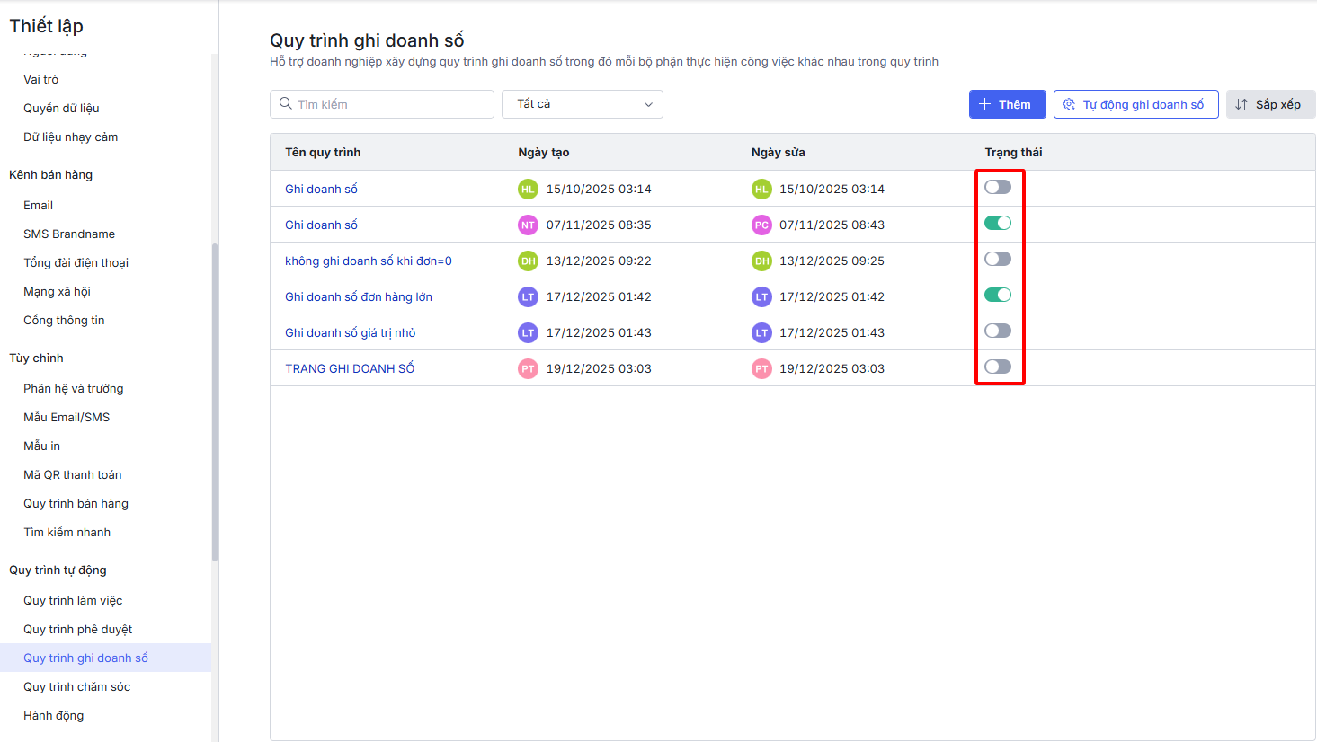 Bước 4: Ở màn hình danh sách Quy trình ghi doanh số, thực hiện Kích hoạt/Ngừng kích hoạt Quy trình ghi doanh số bằng cách Bật/Tắt biểu tượng tại cột Trạng thái.