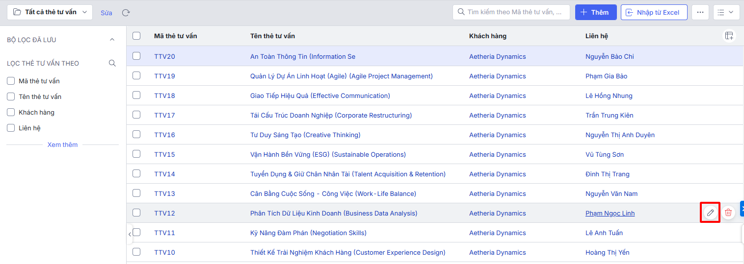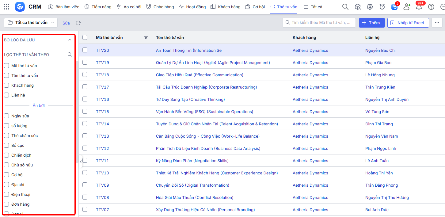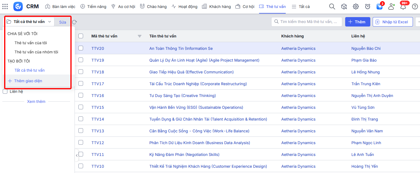 - Thiết lập giao diện, bộ lọc và sửa thông tin Thẻ tư vấn