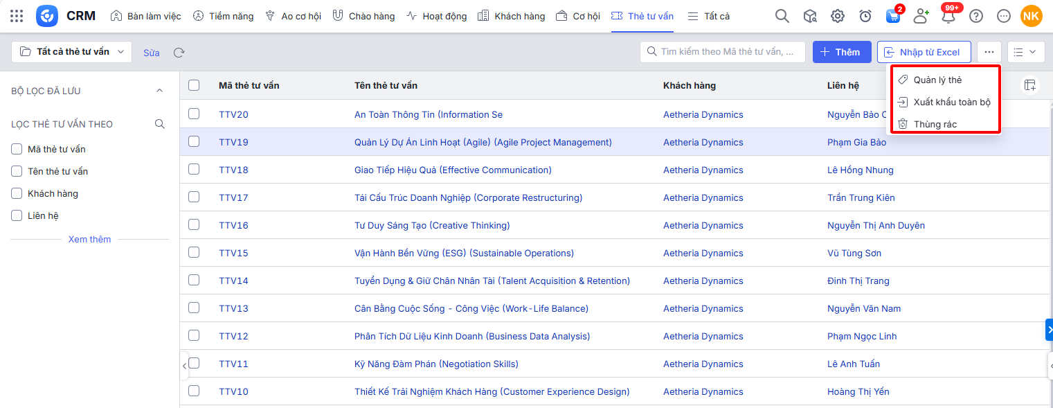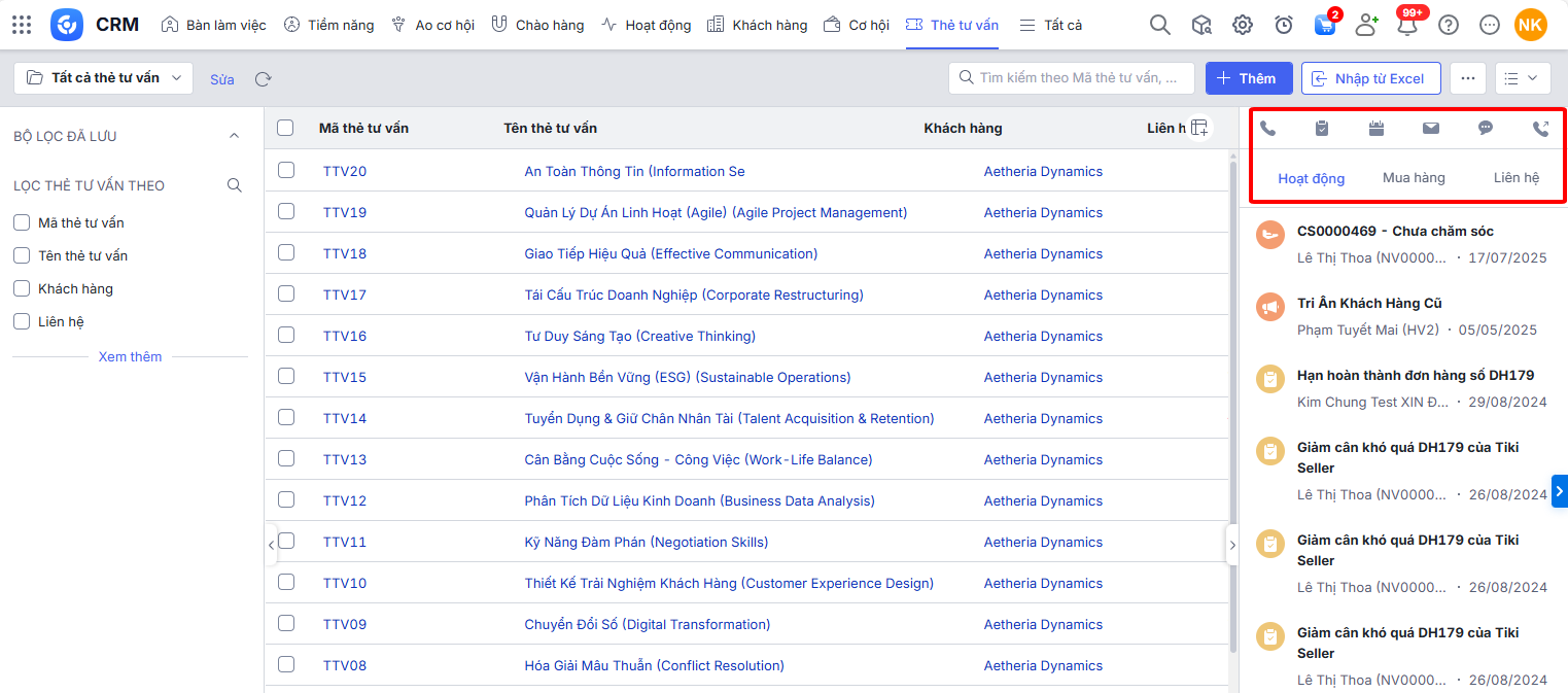 Bài viết hướng dẫn các chức năng quản lý, theo dõi và xử lý danh sách Thẻ tư vấn trên AMIS CRM. Việc quản lý hiệu quả Thẻ tư vấn giúp kiểm soát tốt quá trình hỗ trợ, bảo hành, chăm sóc khách hàng và nâng cao chất lượng dịch vụ sau bán hàng.