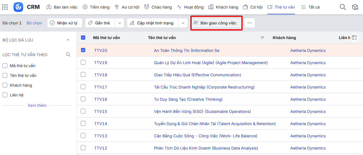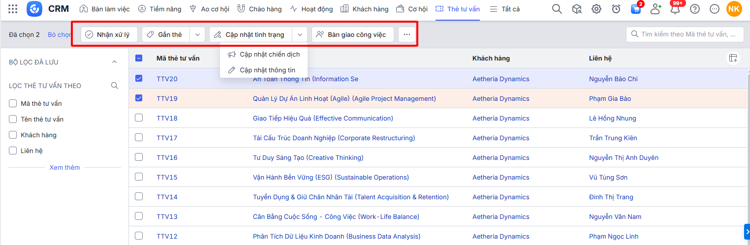 - Thực hiện các chức năng hàng loạt: quản lý thẻ, thùng rác, nhận xử lý, gắn/bỏ thẻ, cập nhật tình trạng, cập nhật chiến dịch, bàn giao công việc, xuất khẩu, xóa