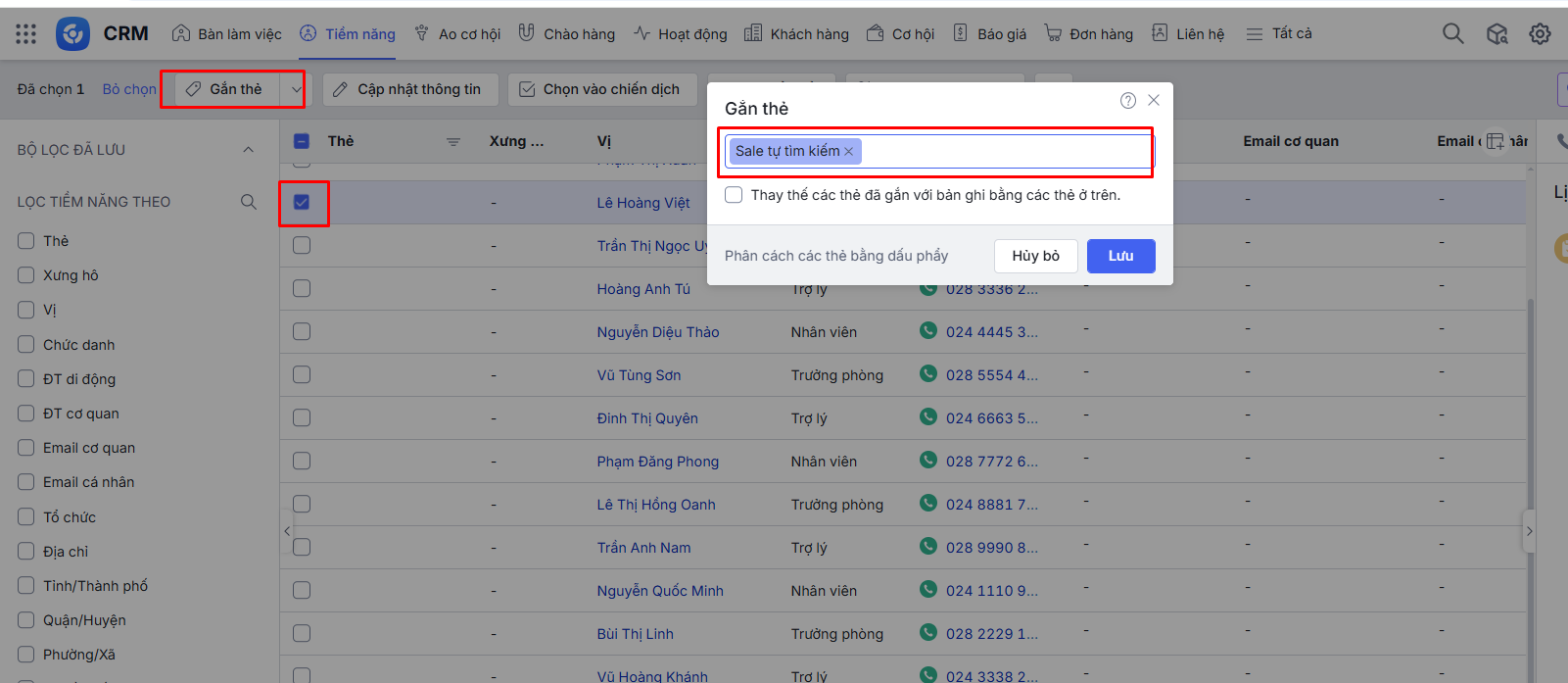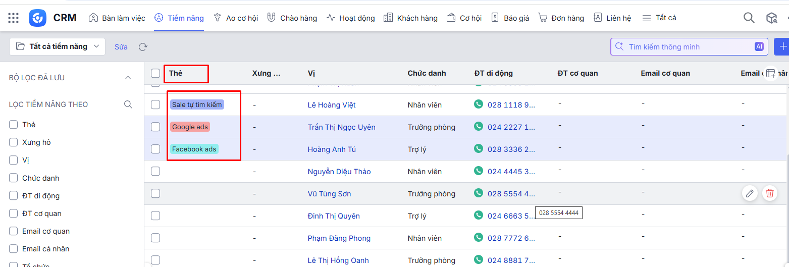Thẻ là ghi chú do NVKD gắn vào bản ghi để mô tả thông tin và hỗ trợ tìm kiếm nhanh. Tính năng này giúp gắn thẻ đồng loạt cho nhóm tiềm năng có đặc điểm chung, hỗ trợ phân loại và theo dõi hiệu quả chăm sóc – bán hàng.