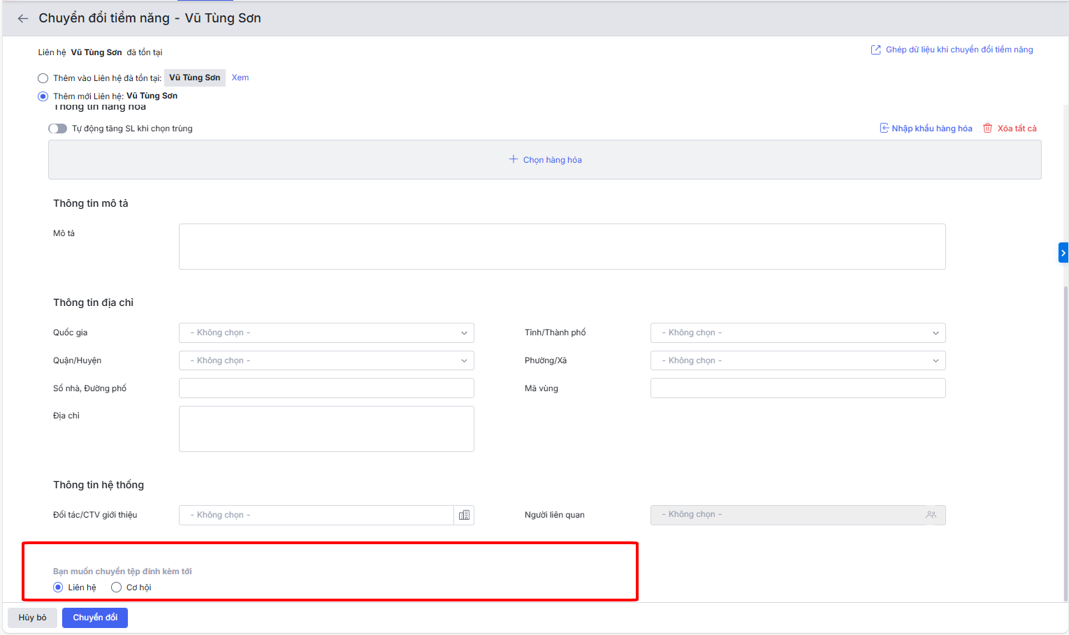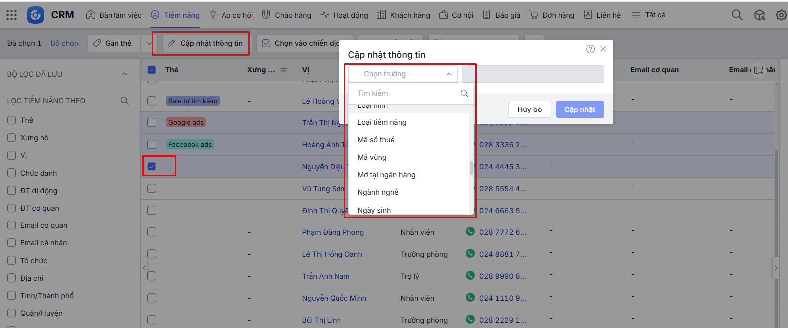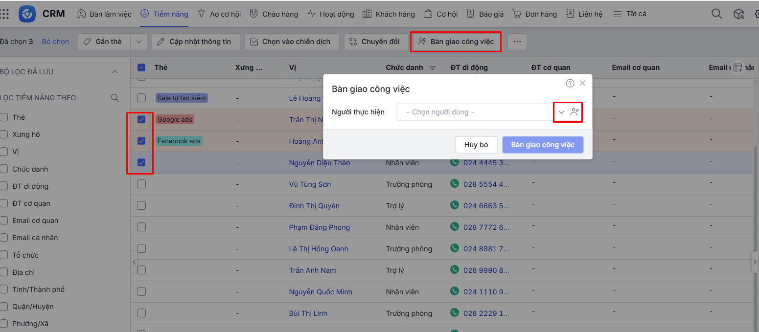Tại màn hình danh sách phân hệ Tiềm năng, tích chọn một hoặc nhiều tiềm năng bất kì để tiến hành chăm sóc.