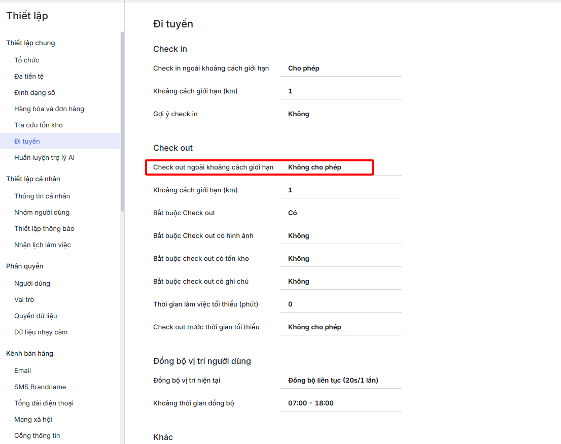 - (Chức năng chỉ hiển thị ở Hoạt động đi tuyến không có thời gian check out và đã thiết lập Check out ngoài khoảng cách giới hạn là Không cho phép)