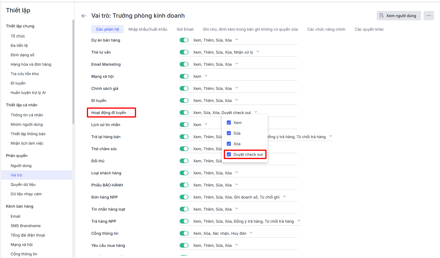 - Lưu ý: Chỉ người dùng được phân quyền Duyệt check out ở phân hệ Hoạt động đi tuyến mới thực hiện được chức năng này. Xem hướng dẫn phân quyền chức năng cho vai trò tại đây.