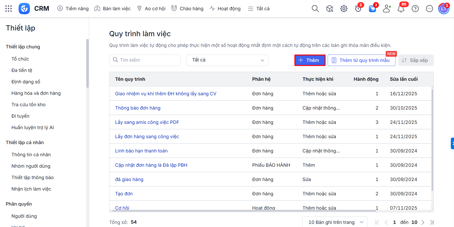 Bước 2: Trên giao diện Quy trình làm việc, nhấn Thêm.