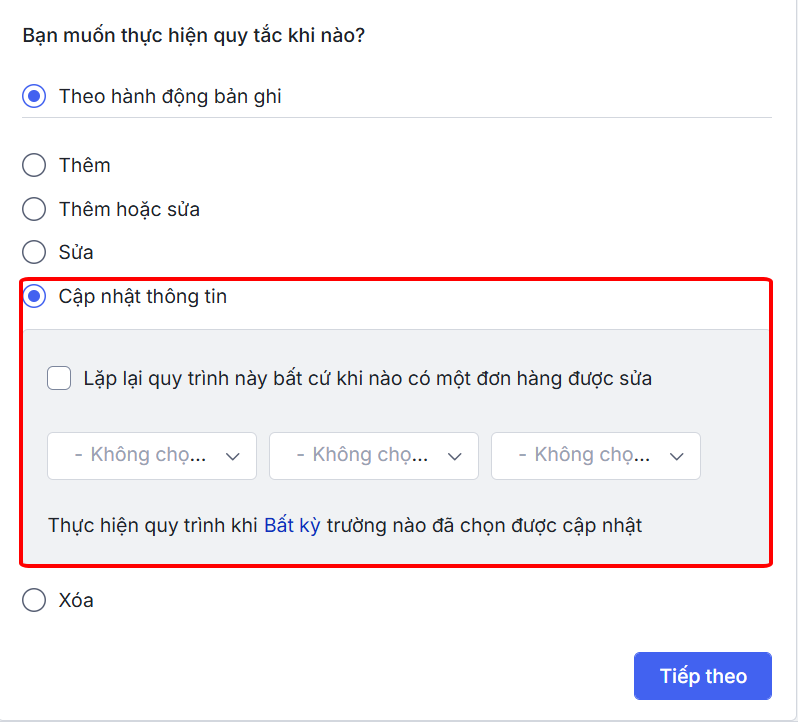 - Chọn Bất kỳ : Khi cập nhật thông tin bất kỳ 1 trong các trường đã chọn, hệ thống sẽ thực hiện hành động