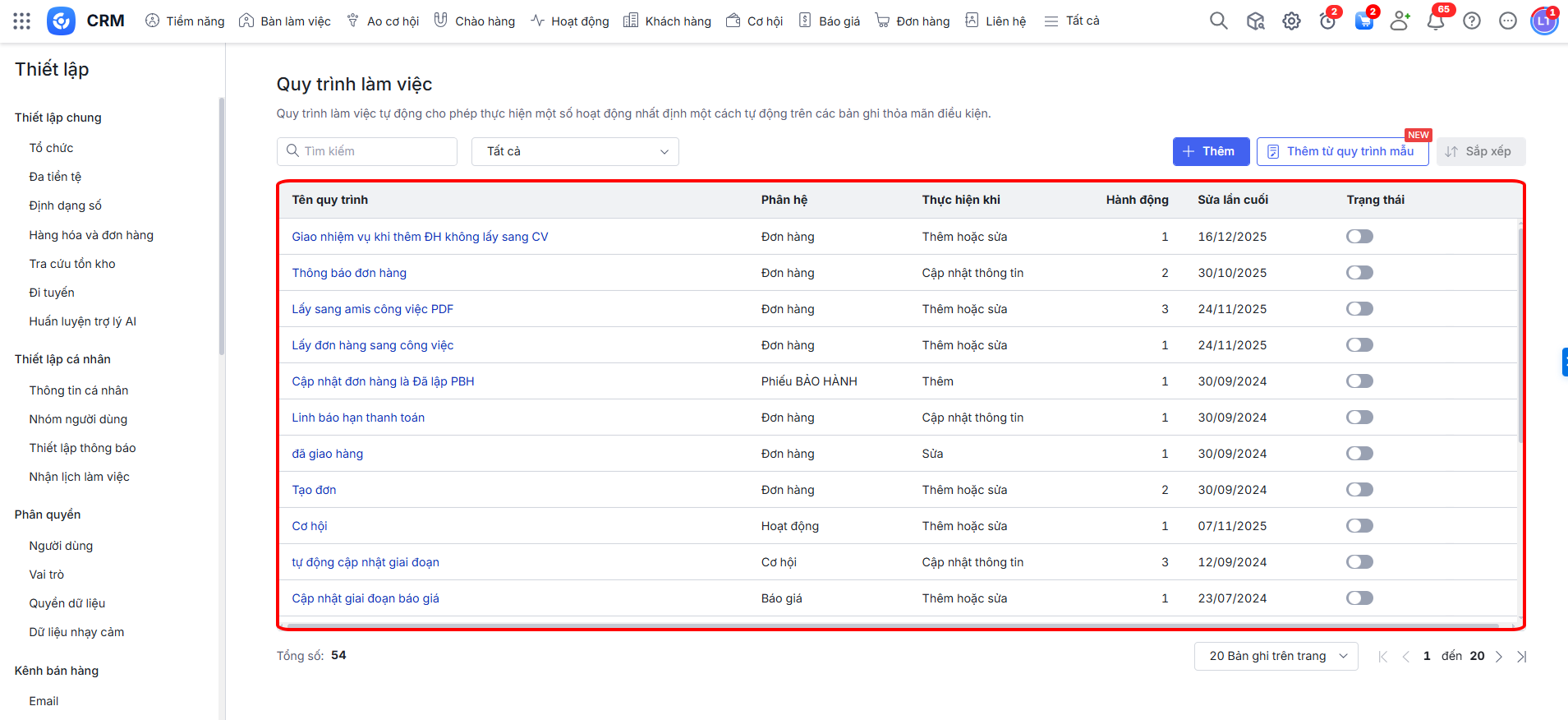 Phần mềm cho phép xem danh sách các quy trình làm việc tự động đã thiết lập trong doanh nghiệp dưới dạng bảng, bảng tóm tắt. Đồng thời, người dùng có thể lọc theo phân hệ và sắp xếp thứ tự ưu tiên của các quy trình, giúp việc quản lý và theo dõi quy trình tự động trở nên dễ dàng và hiệu quả hơn.