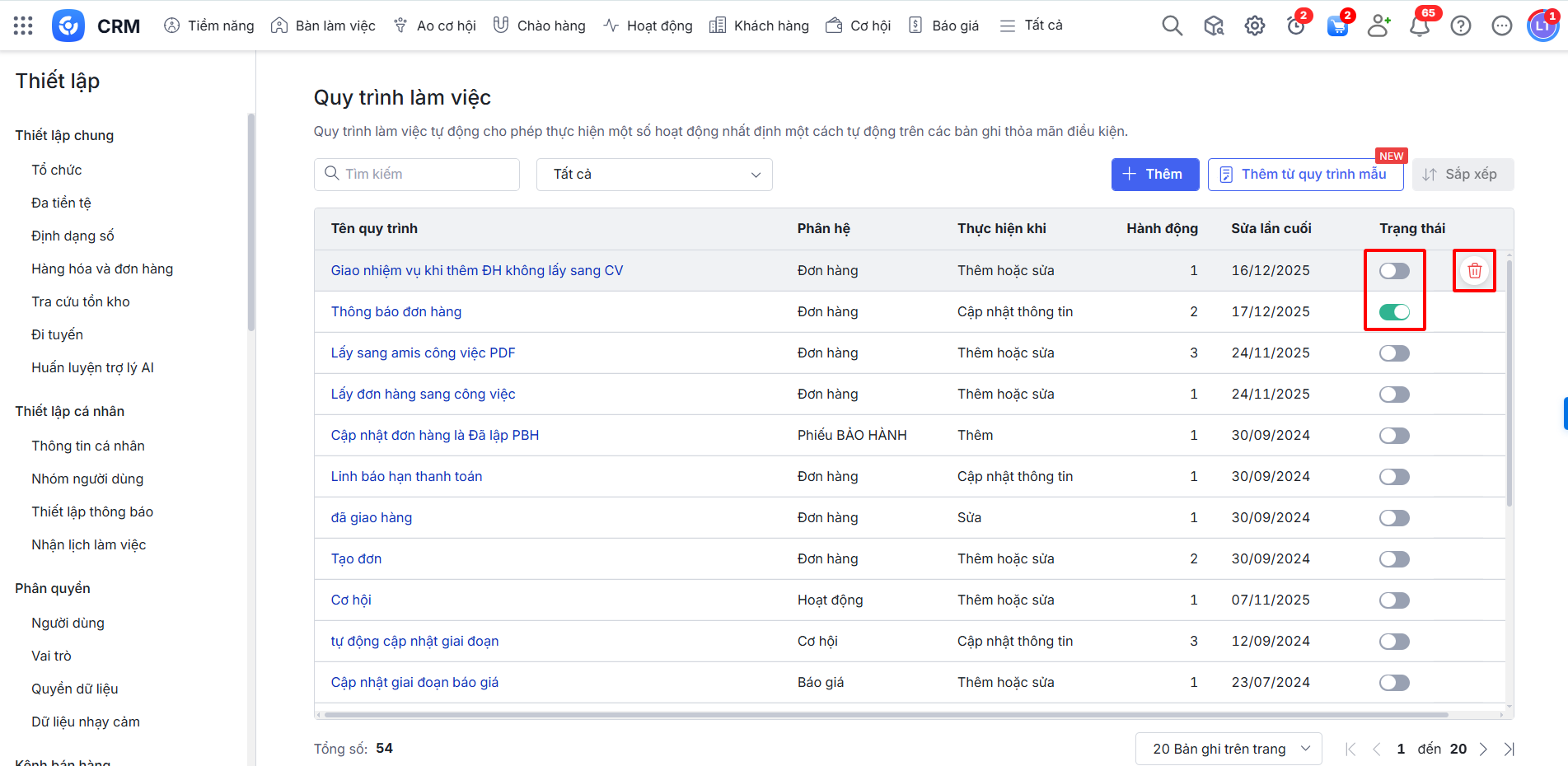 Bước 4: Để kích hoạt/ngừng kích hoạt quy trình làm việc, người dùng Bật/Tắt biểu tượng tại cột Trạng thái.