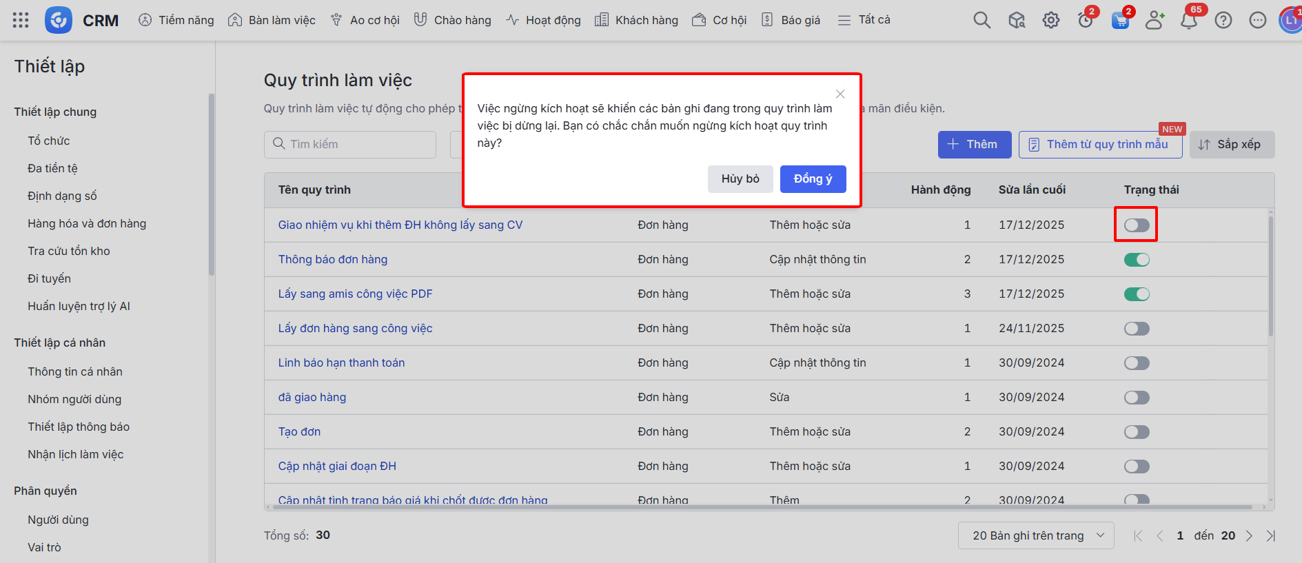 Bước 1: Ngừng kích hoạt quy trình sau đó nhấn đồng ý