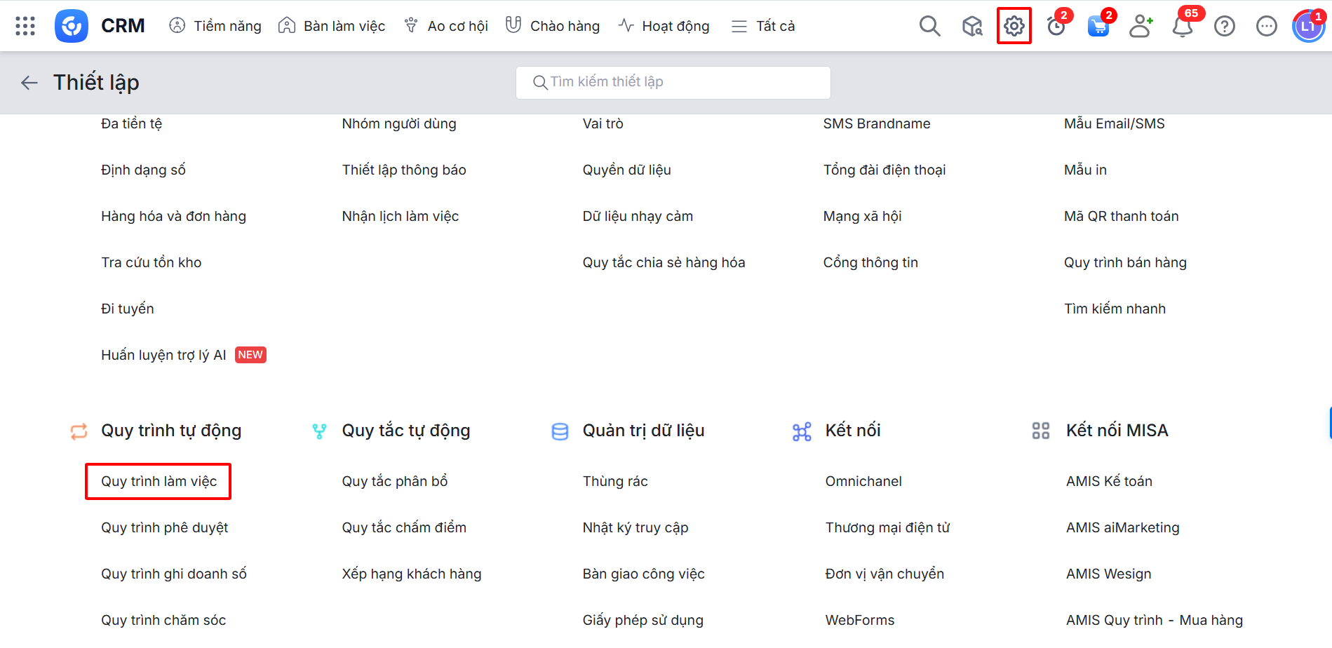 để vào Thiết lập \ vào Quy trình tự động \ chọn Quy trình làm việc.