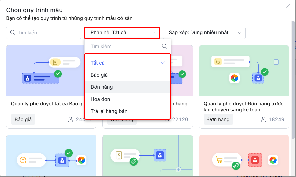 Bước 4: Người dùng có thể Tìm kiếm quy trình, Lọc theo phân hệ, Sắp xếp thứ tự hiển thị danh sách quy trình mẫu.