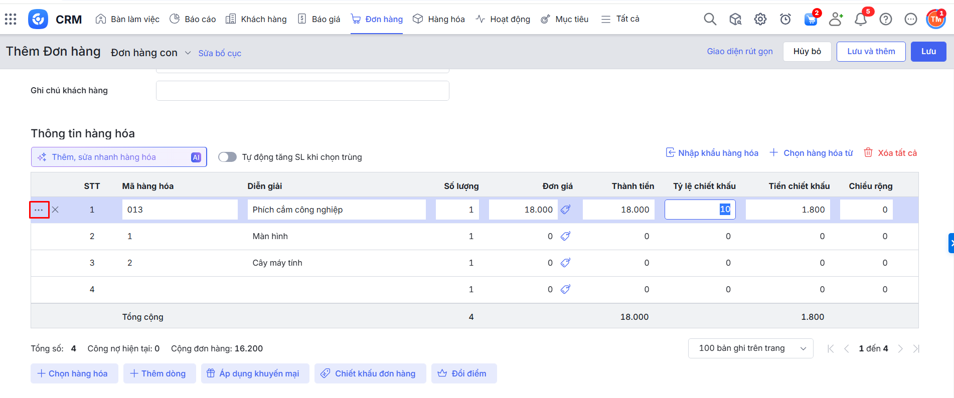 Lưu ý: Chức năng dùng tại bảng thông tin hàng hóa trên các giao diện Thêm/Sửa Cơ hội, Báo giá, Đơn hàng, Hóa đơn.
