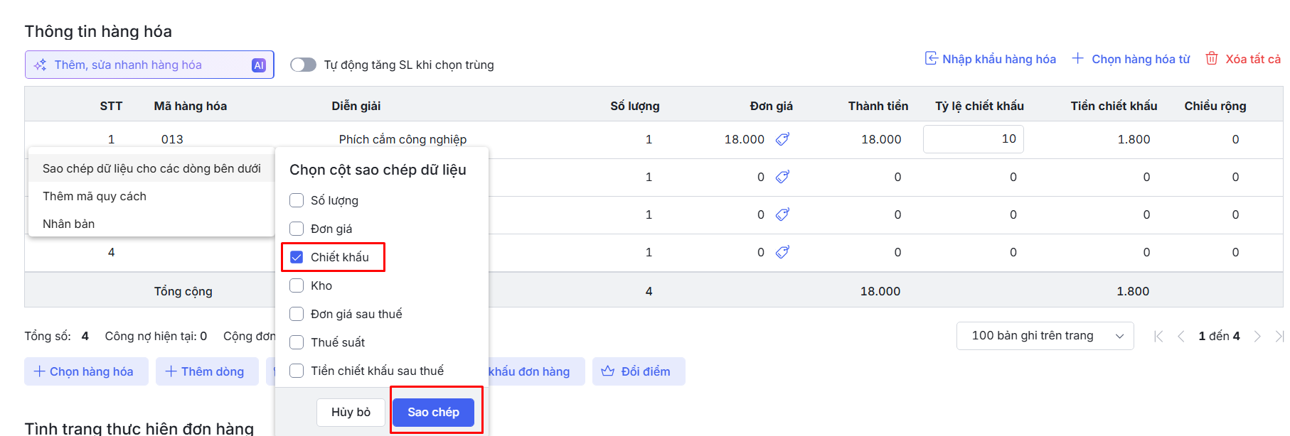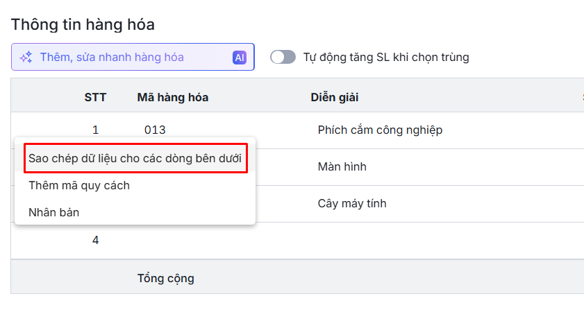 Bước 4: Nhấn Sao chép để hoàn thành\Hệ thống thực hiện sao chép các dữ liệu ở cột thông tin được chọn lấy từ dòng hàng hóa đang thao tác xuống cho tất cả các dòng hàng hóa phía dưới.
