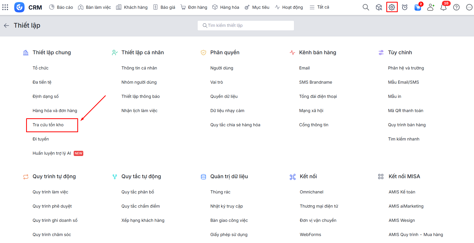 Bước 1: Trên AMIS CRM\ Nhấn biểu tượng bánh răng