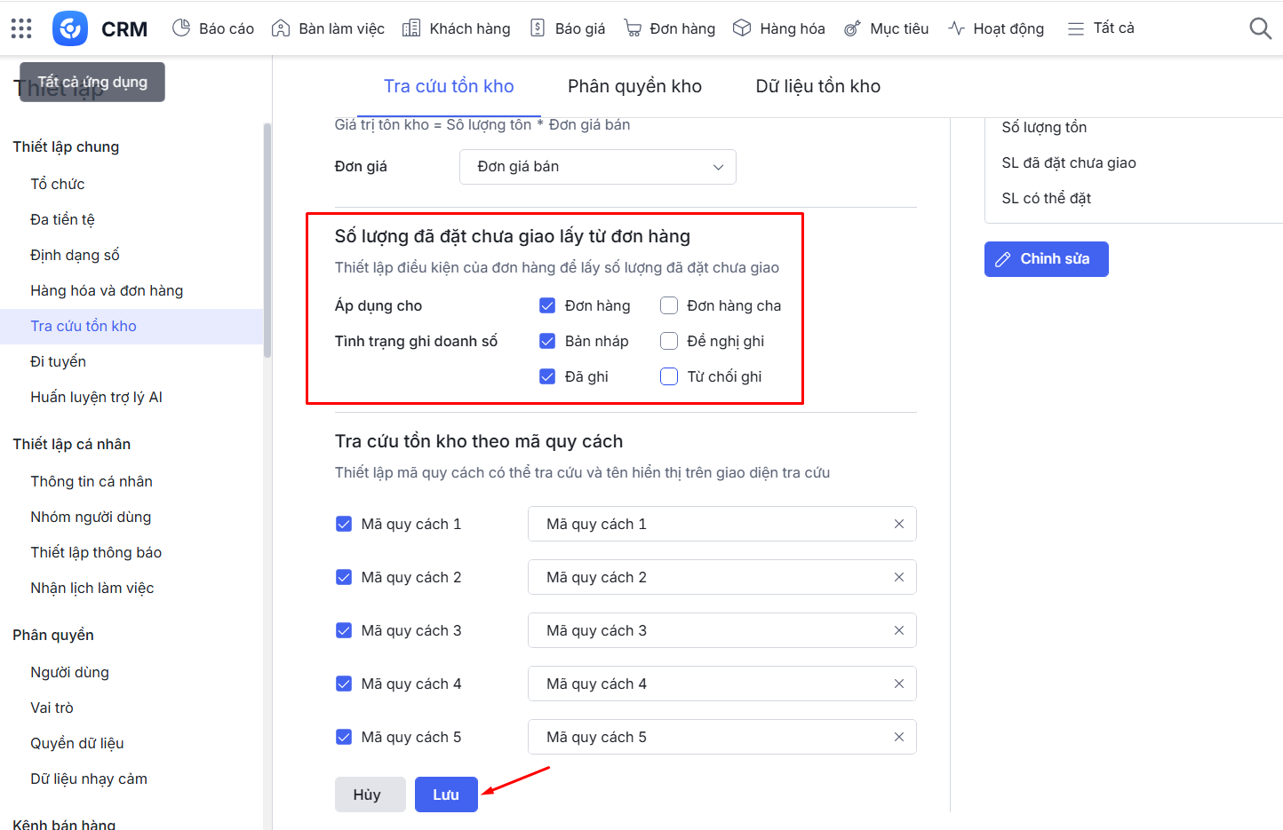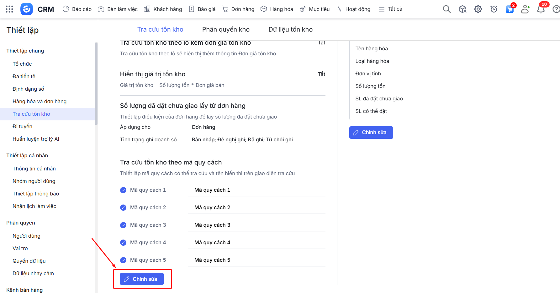 Bước 4: Ở mục Tra cứu tồn kho\ Nhấn Chỉnh sửa để sửa thiết lập.