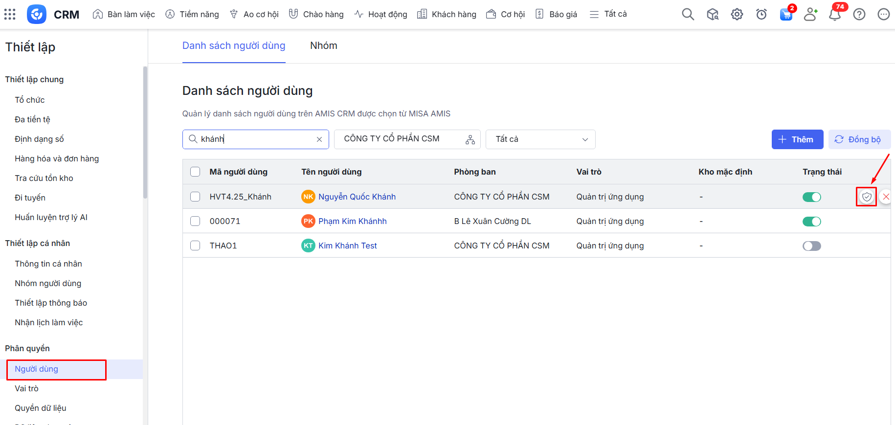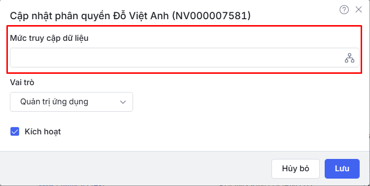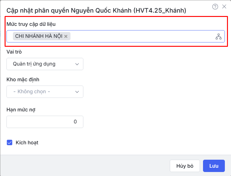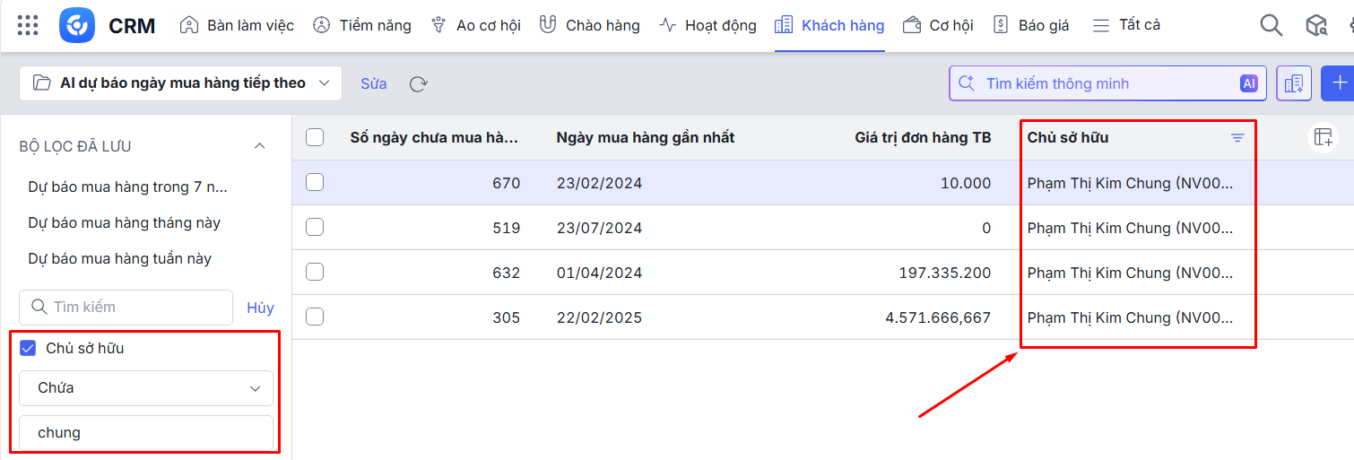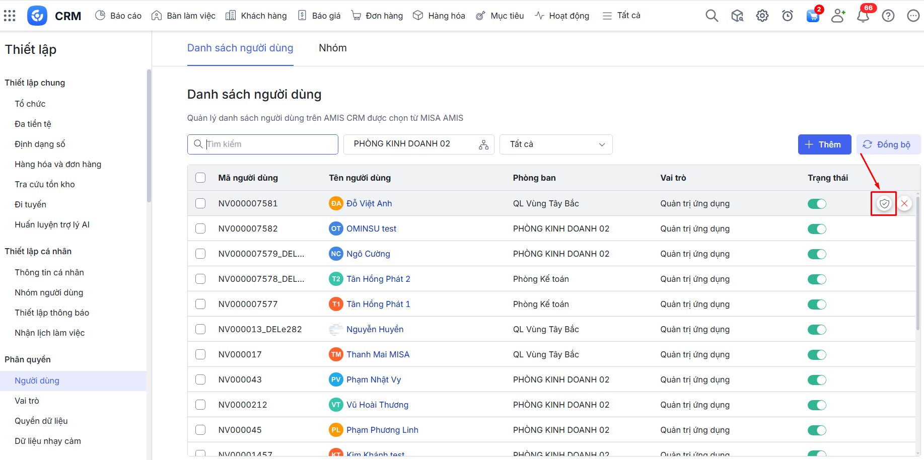 - Có chủ sở hữu (Riêng đối với Đơn hàng thì là Người thực hiện hoặc Nhân viên được ghi doanh số) là người dùng thuộc Cơ cấu tổ chức mà người dùng đó có quyền truy cập dữ liệu theo thiết lập người dùng.