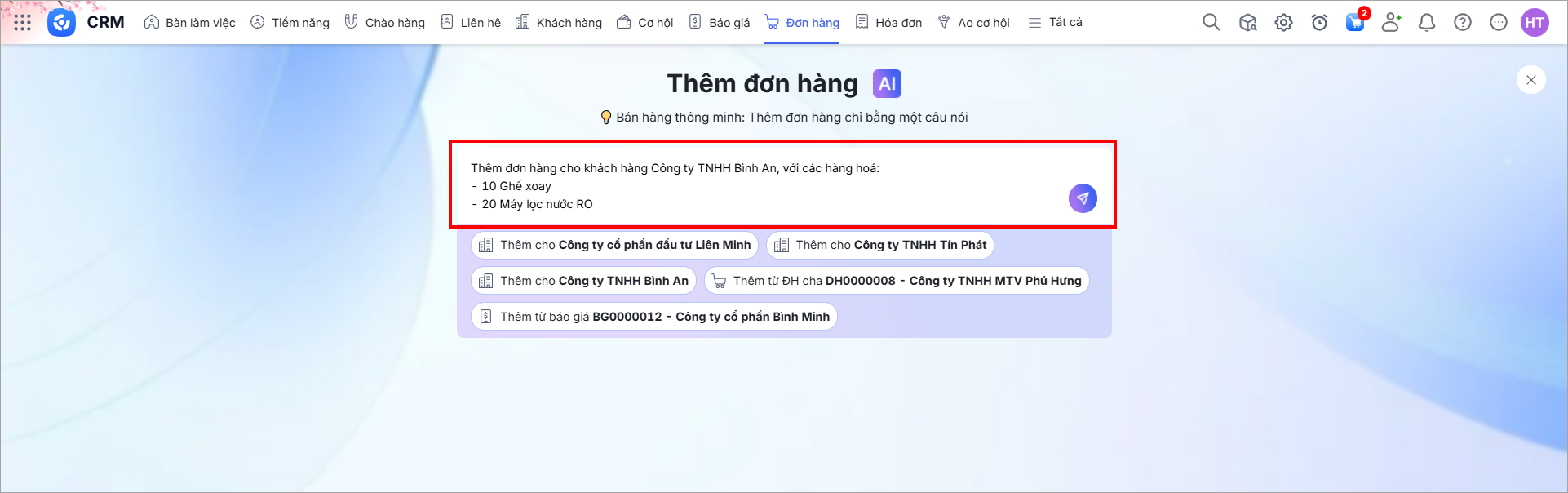 Bài viết hướng dẫn cách sử dụng AI để thêm nhanh đơn hàng, giúp NVKD tiết kiệm thời gian thao tác.