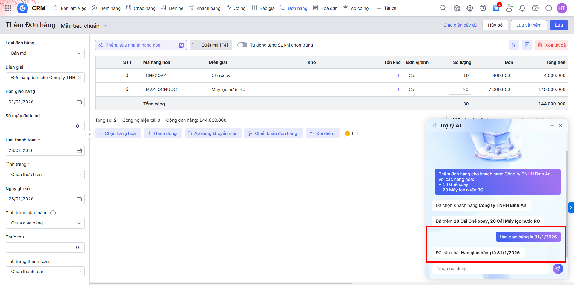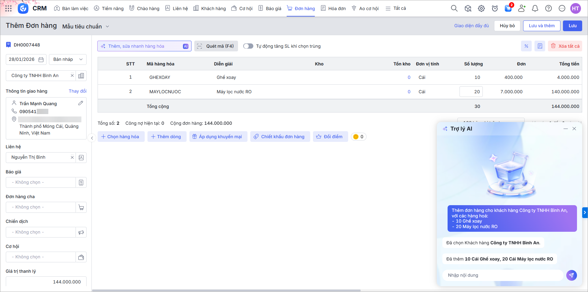 Ví dụ: Thêm đơn hàng cho khách hàng Công ty TNHH Bình An, với các hàng hoá: 10 Ghế xoay và 20 Máy lọc nước RO.