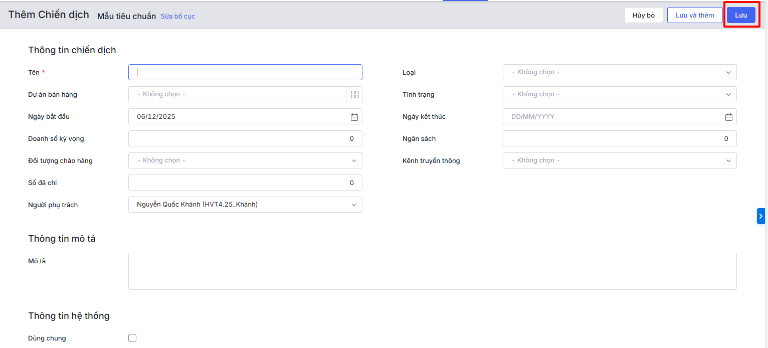 - Thêm mới Chiến dịch bằng cách nhập thủ công thông tin