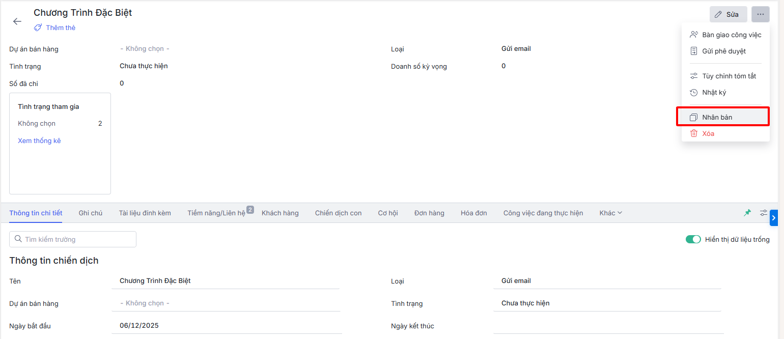 - Nhân bản Chiến dịch từ bản ghi có sẵn và chỉnh sửa thông tin