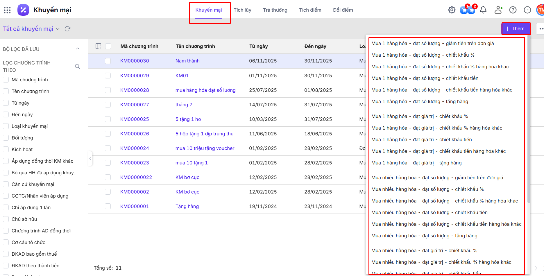 Bước 1: Trên AMIS Khuyến mại\ Ở tab Khuyến mại\ Nhấn Thêm\ Chọn một trong các loại khuyến mại.