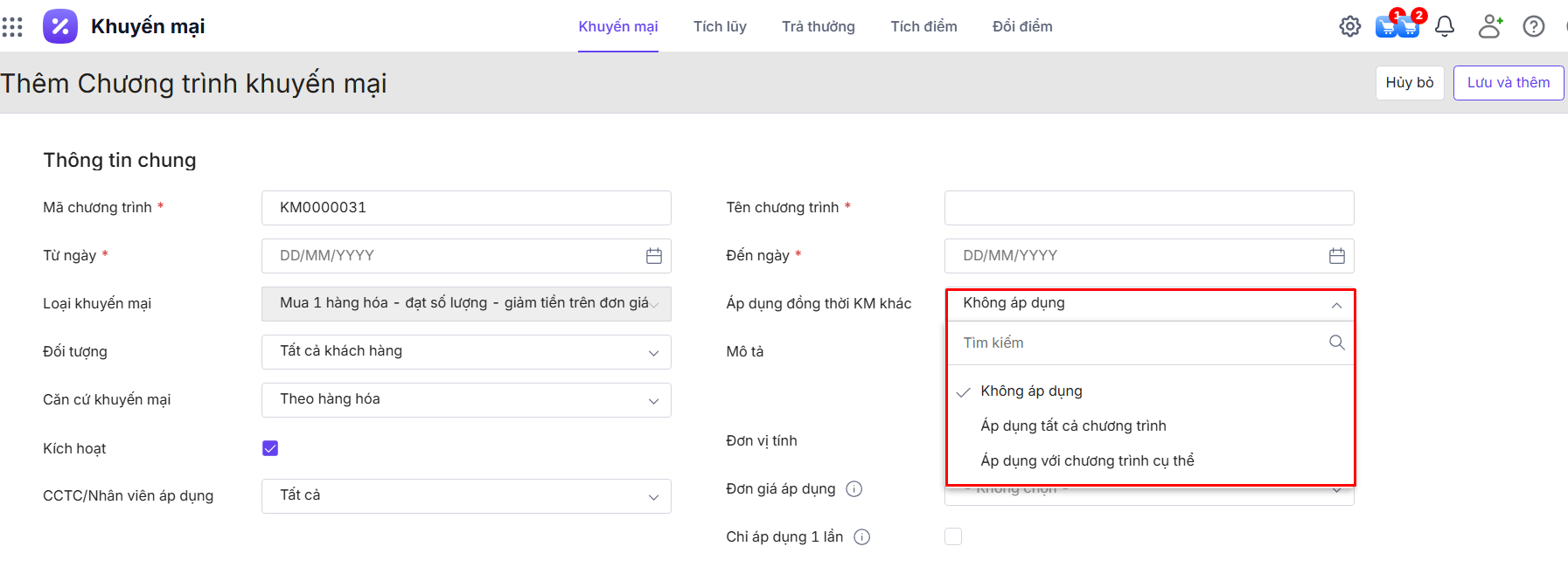 - Không áp dụng: Không áp dụng đồng thời CTKM đang thao tác với các CTKM khác.