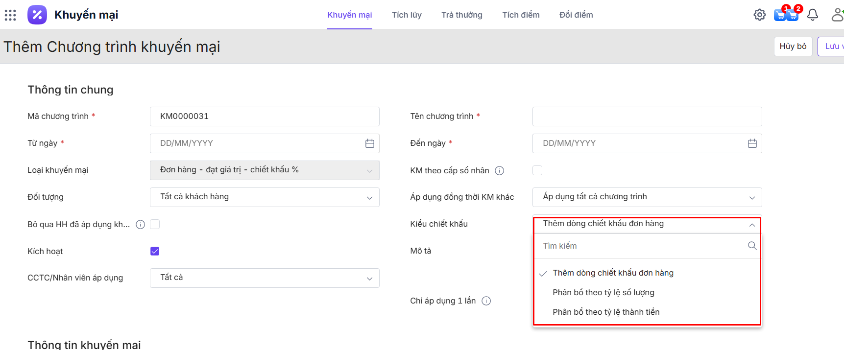 - Loại khuyến mại Đơn hàng – đạt giá trị – chiết khấu % và Đơn hàng – đạt giá trị – chiết khấu tiền có thêm thông tin Kiểu chiết khấu.