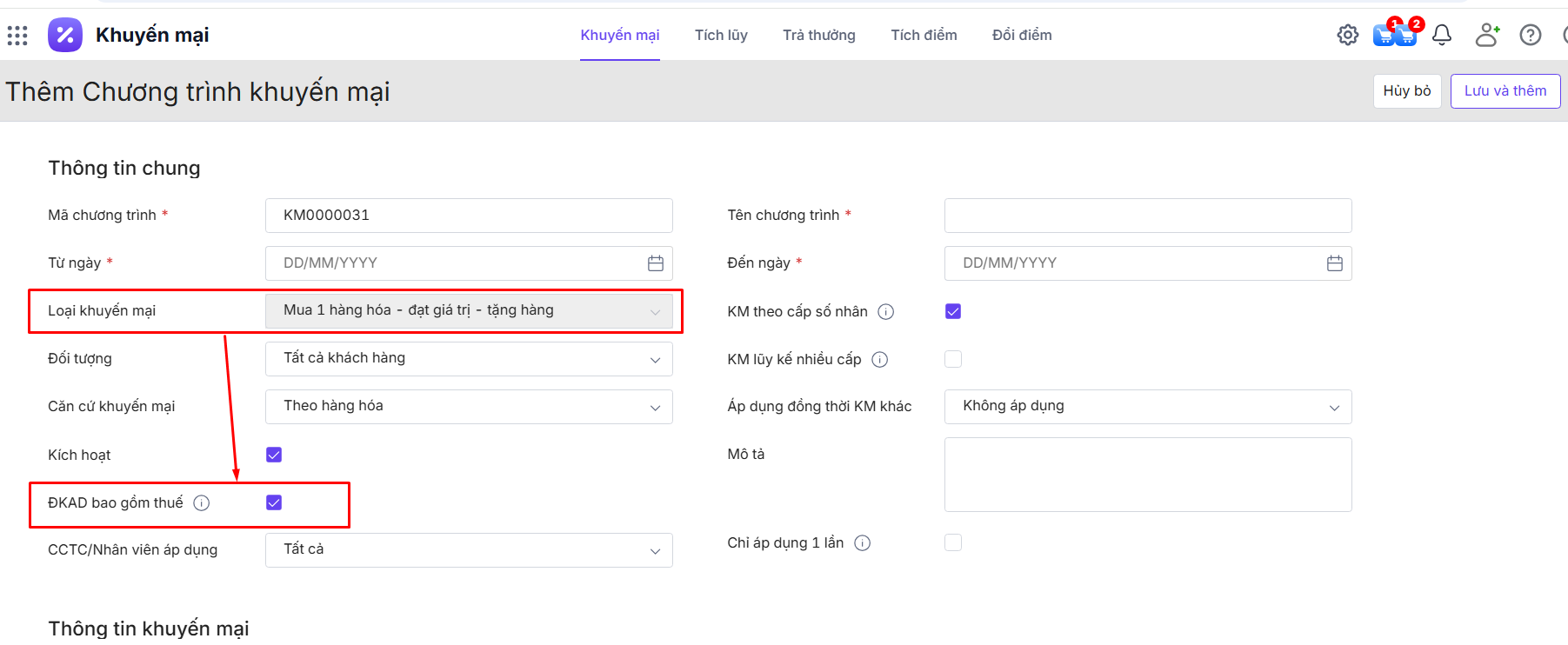 - Loại khuyến mại Mua 1 hàng hóa – đạt giá trị – tặng hàng, Mua nhiều hàng hóa – đạt giá trị – tặng hàng, Đơn hàng – đạt giá trị – tặng hàng có thêm thông tin ĐKAD bao gồm thuế. Nếu tích chọn ĐKAD bao gồm thuế thì khi áp dụng CTKM, CTTL, hệ thống kiểm tra điều kiện giá trị hàng hóa/đơn hàng từ Tổng tiền (sau thuế) của hàng hóa/đơn hàng tương ứng.