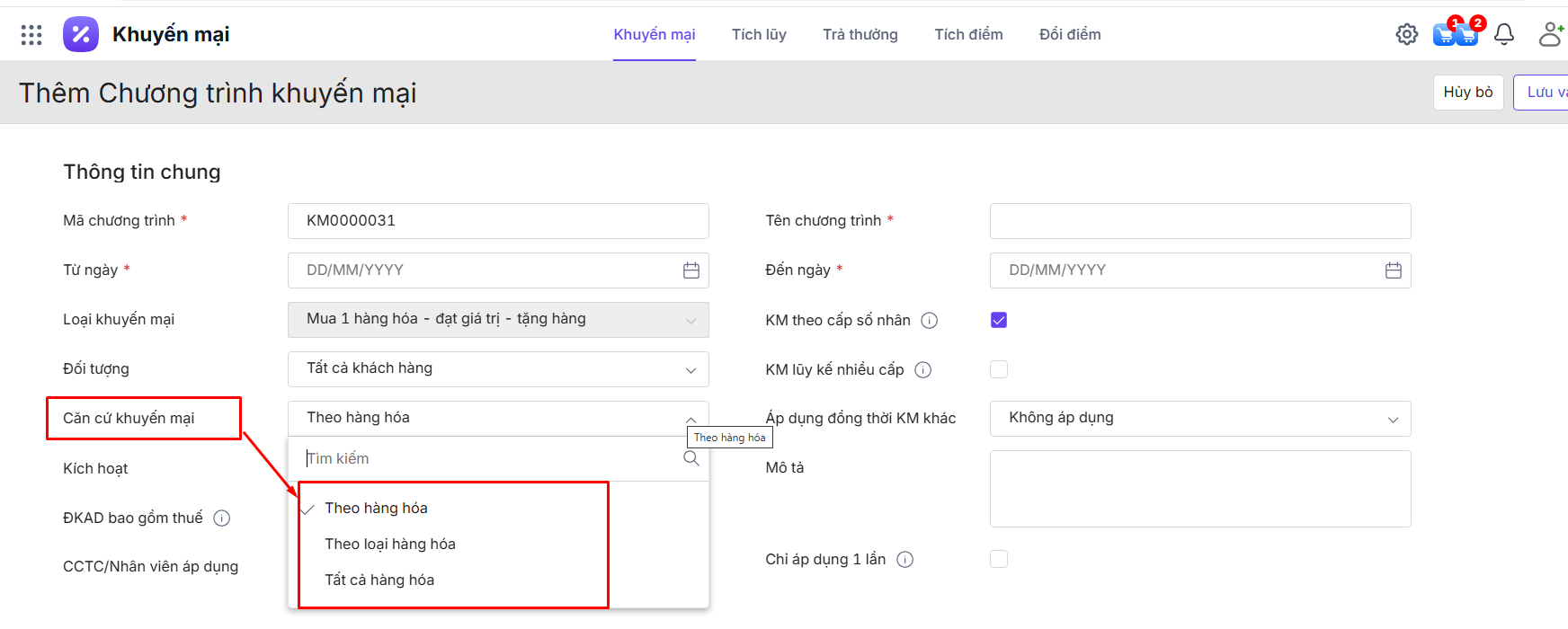 - Các loại khuyến mại Mua 1 hàng hóa, Mua nhiều hàng hóa có thêm thông tin Căn cứ khuyến mại theo hàng hóa hoặc theo loại hàng hóa.