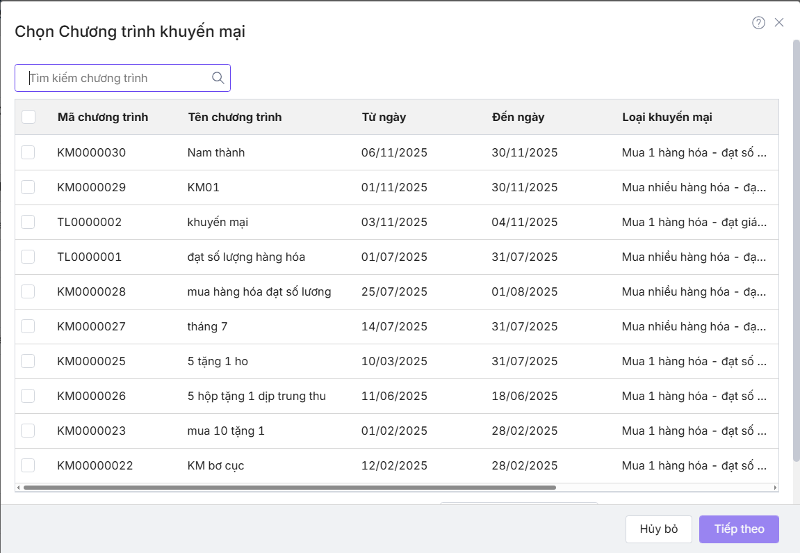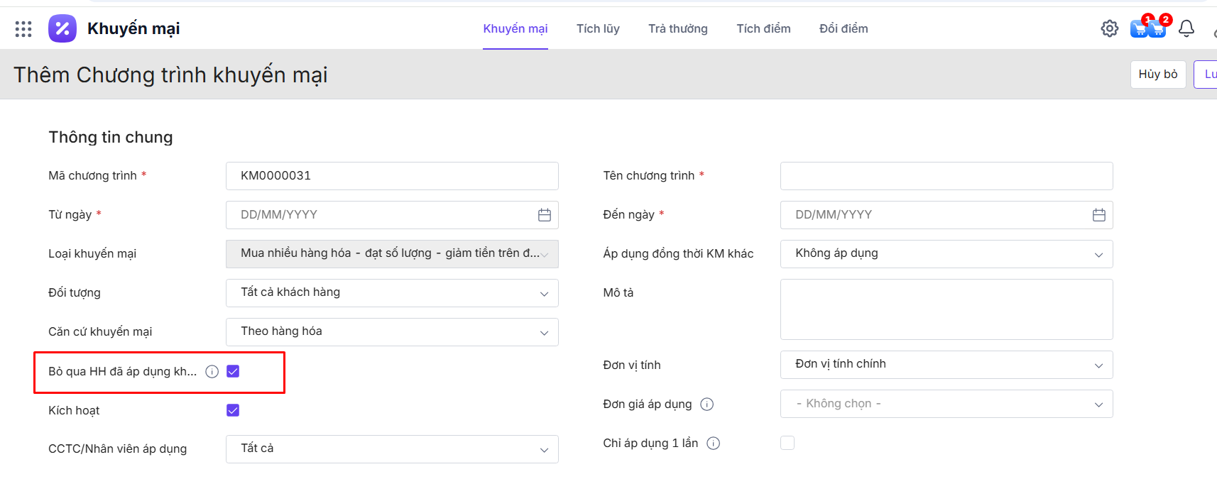 - Áp dụng với tất cả chương trình: Áp dụng được đồng thời CTKM đang thao tác với tất cả các CTKM đang kích hoạt.